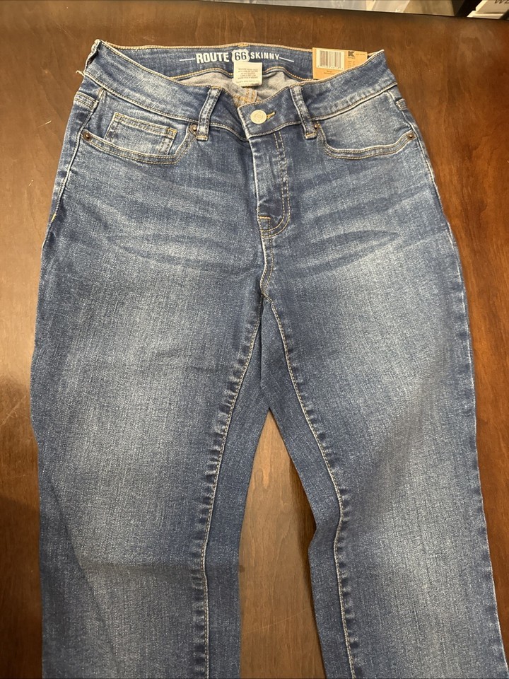 The Route 66 Skinny Jeans in size 2 regular are designed for women looking for a sleek and stylish denim option. These jeans feature a waist size of 25 inches and come in a classic blue color. The skinny style offers a flattering fit that hugs the body, making them perfect for both casual and dressier occasions. Made by the trusted brand Route 66, these jeans combine quality craftsmanship with a fashionable design for a versatile addition to any wardrobe.