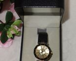 Japan quartz movement, sapphire glass, yellow tone base metal case and leather strap, water resistant (3 ATM). Case measures approximately:34mm x 28mm (1.33 inch x 1.10 inch).