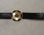 Japan quartz movement, sapphire glass, yellow tone base metal case and leather strap, water resistant (3 ATM). Case measures approximately:34mm x 28mm (1.33 inch x 1.10 inch).