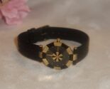 Japan quartz movement, sapphire glass, yellow tone base metal case and leather strap, water resistant (3 ATM). Case measures approximately:34mm x 28mm (1.33 inch x 1.10 inch).