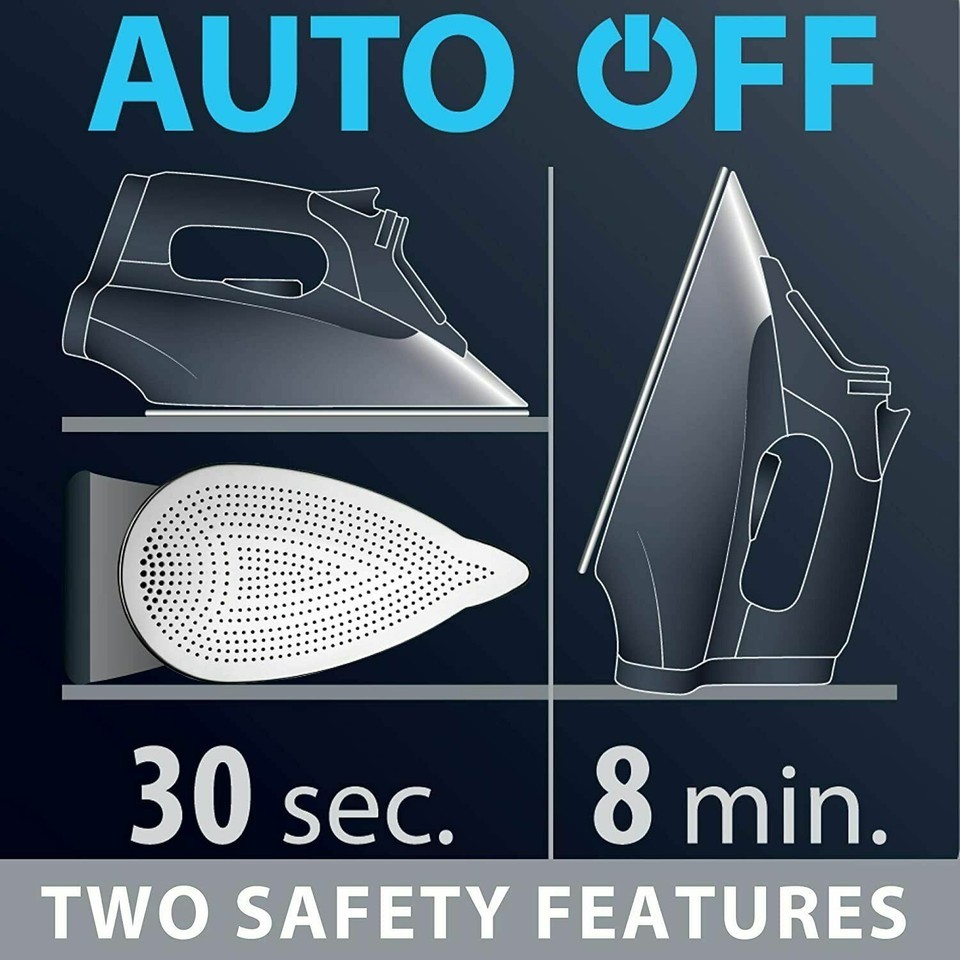 SAFETY COMES FIRST WITH ROWENTA ? To prevent any sort of accident, this iron comes with a 3-way automatic shut-off system after being left untouched for 8 minutes vertically, 30 seconds face down or on its side.