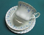 Royal Albert England Mid Century TRIO cup,saucer and cake plate "Memory Lane" pattern, delicate blue flowers, cup is 2 1/2" tall by 3 1/2" diam, saucer is 5 1/2" diam and cake plate is 6 1/4", very good condition, some light surface scratches commensurate with age?[88c-