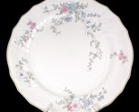Royal Doulton Calais porcelain dinner plate, pattern no. TC1149, from the Moselle Collection. Delicate pink, blue and white flowers with green foliage decorate the rim of the plate. The slightly scalloped rim is trimmed in green. This plate is 10-3/4 inches in diameter. There are a few surface marks from contact with other plates, but this is unused stock from a china shop that closed.
