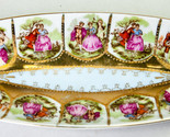 Royal Vienna porcelain oval relish dish decorated with courtship scenes by the artist, Fragonard. The dish has gold trim with beading. The dish is 10" long, 3-3/8" wide and 1-1/2" high. Pre-owned condition, very good. Marked Royal Vienna, 1102, and with a beehive symbol.