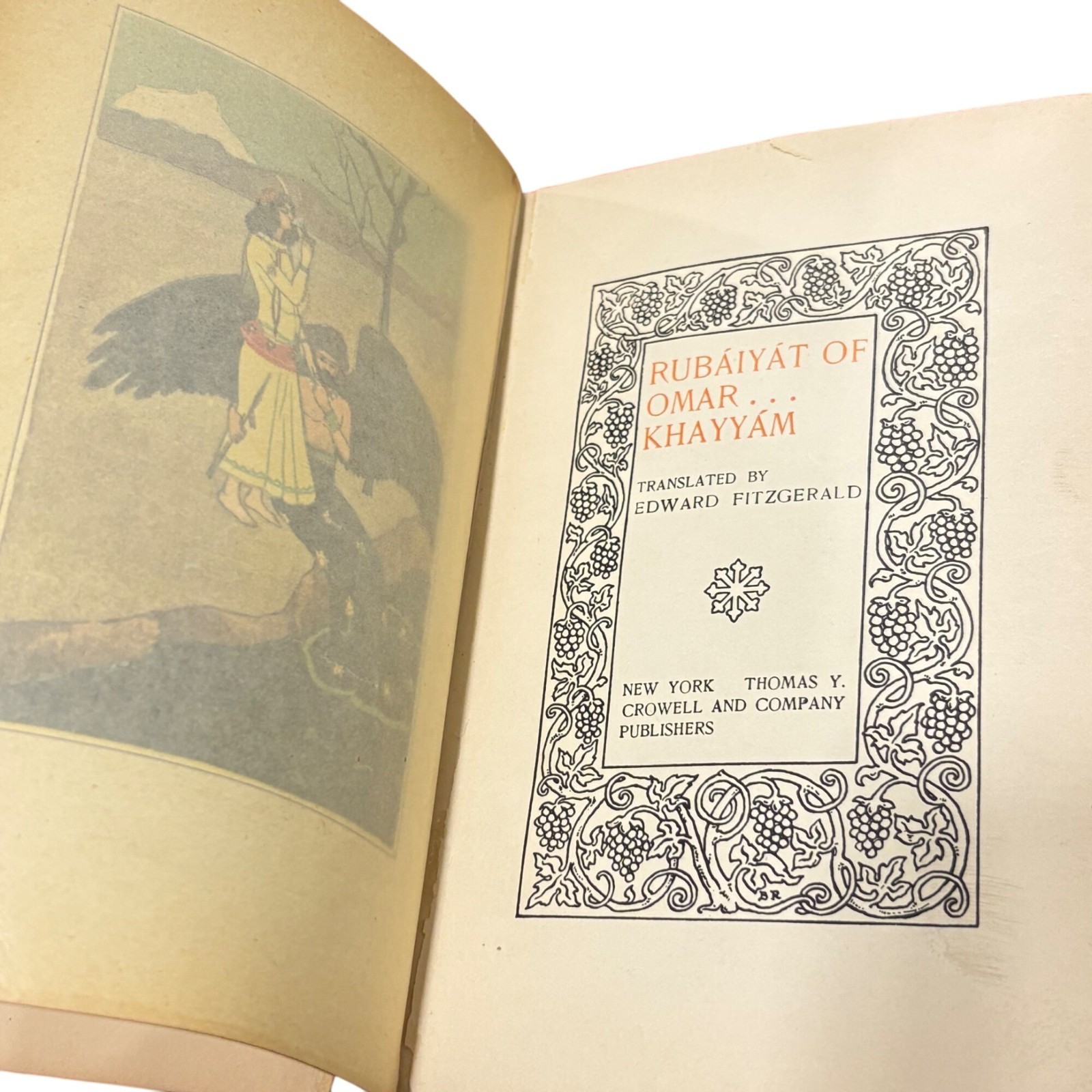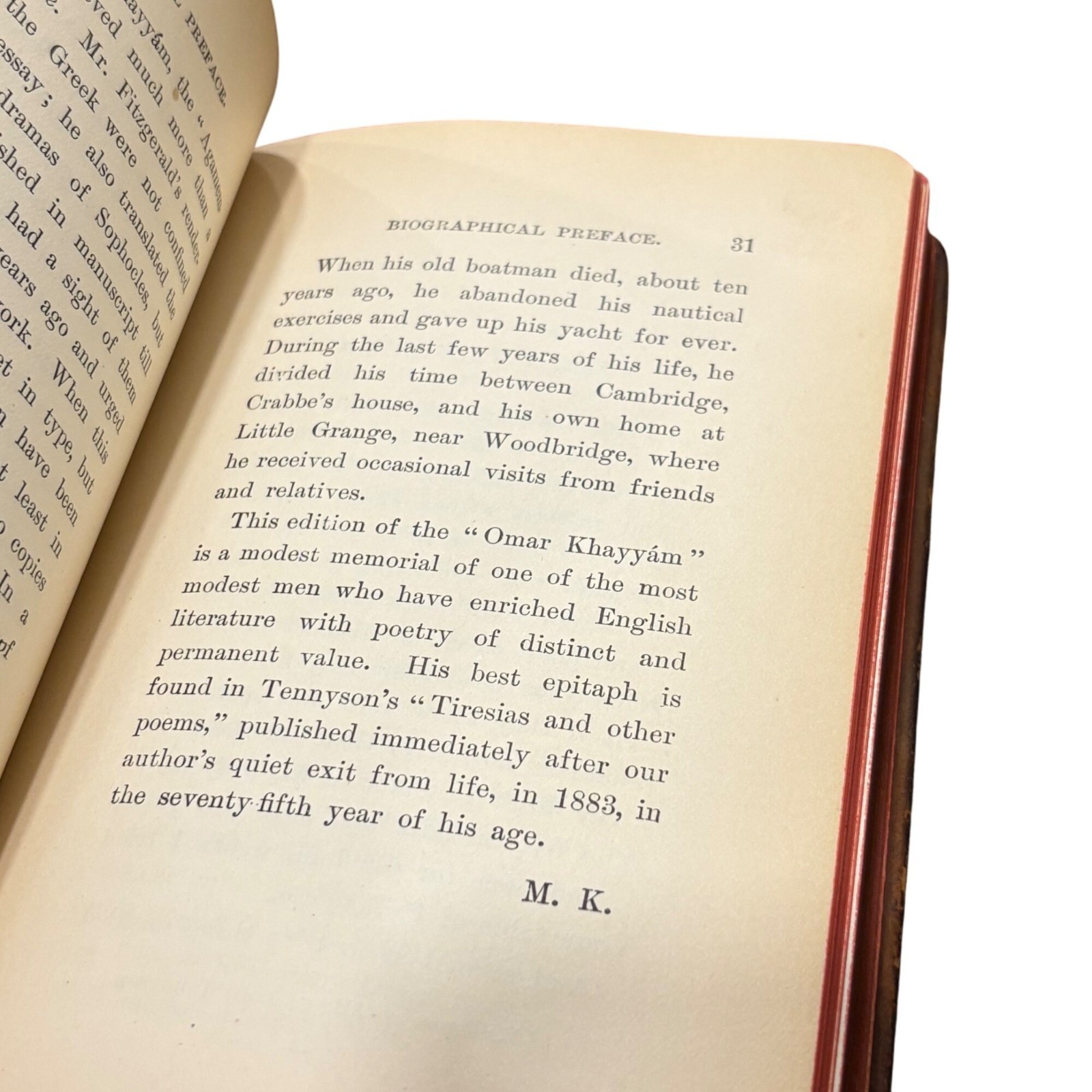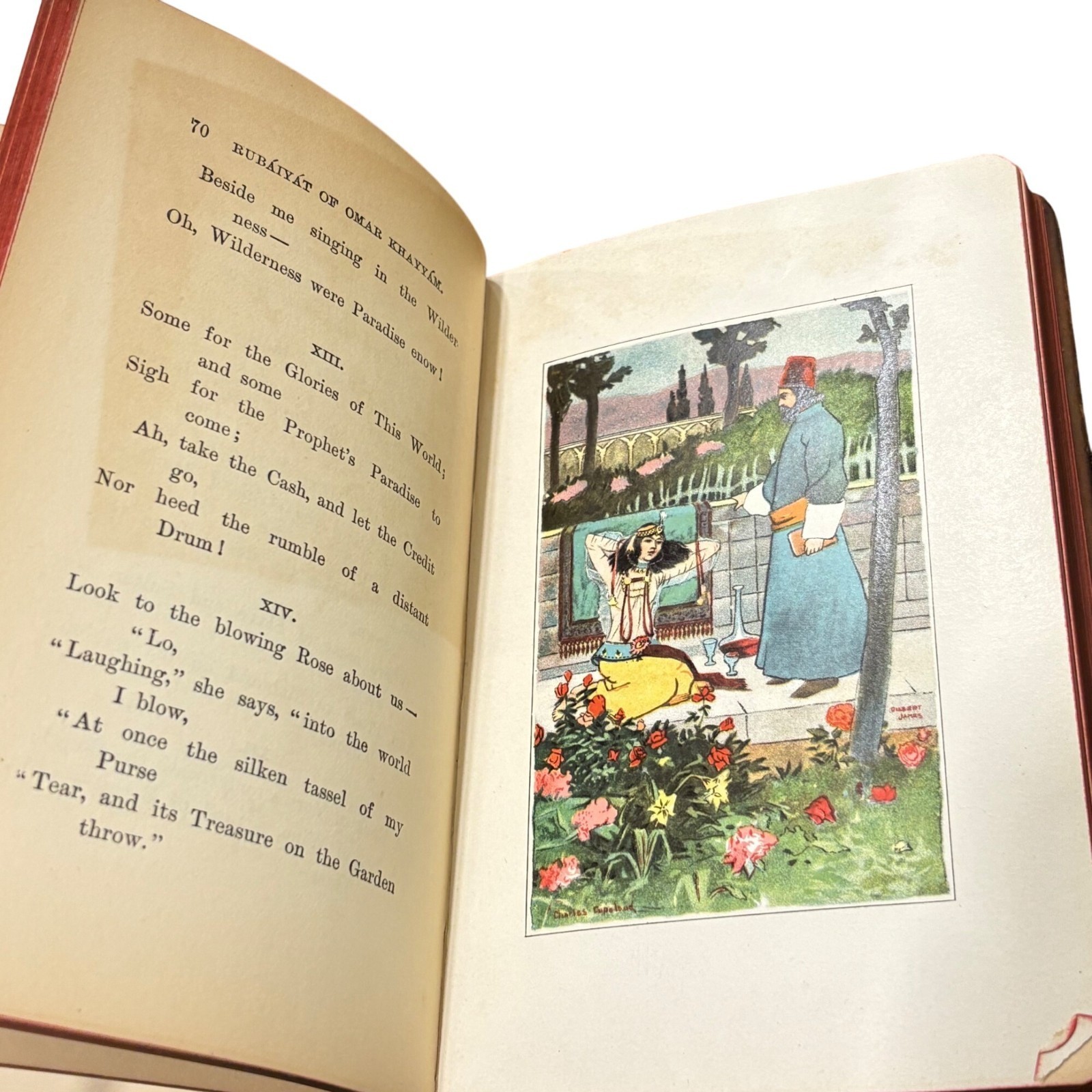 This edition of the "Rubaiyat Of Omar Khayyam" is translated by Edward Fitzgerald. It features a vintage leather binding with color illustrations.