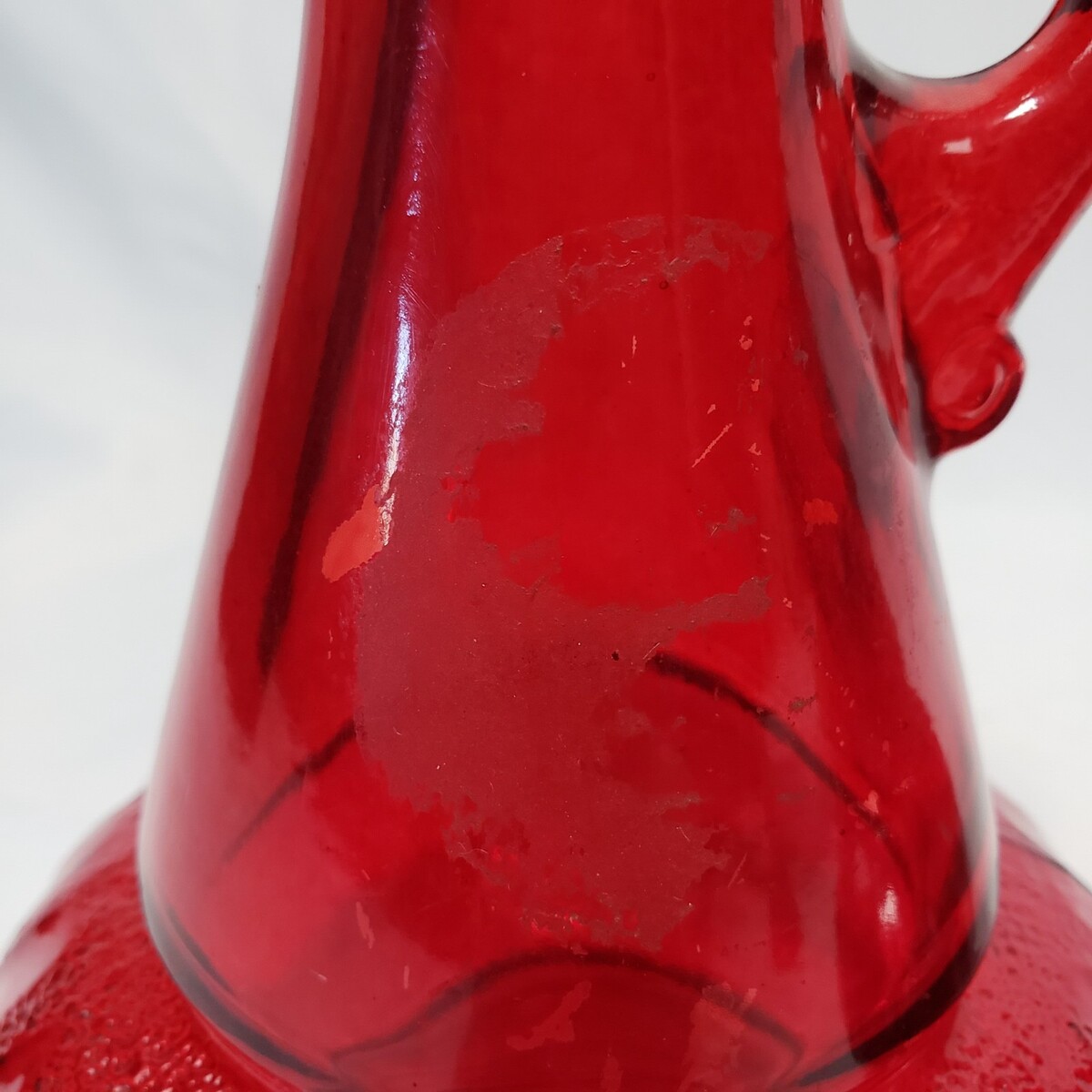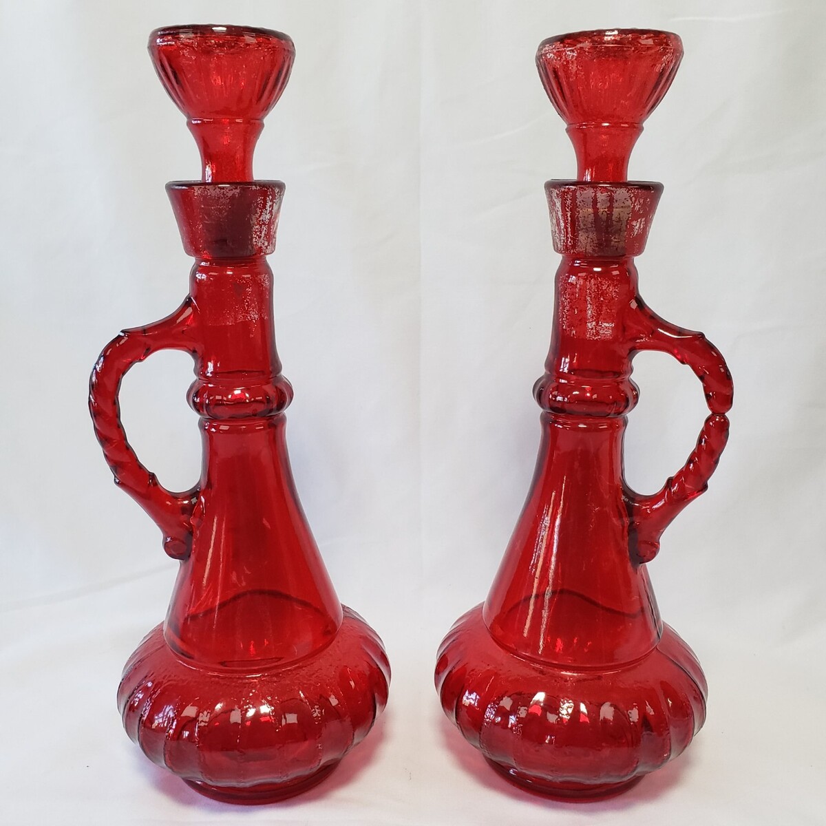 Vintage ruby red glass genie (remember the 1965 "I Dream of Jeannie" TV show?) bottles with classic mid?century modern charm. These decorative decanters feature hand?blown craftsmanship and bold red flash finish. Commensurate with age, the bottles show age?appropriate wear including flaking, peeling of the red flash (as shown in photos), and overall shelf-wear, adding authentic patina for collectors who appreciate true vintage character. No chips, no cracks in glass. Glass lid stoppers are intact, as well as the original corks and plastic air-resistant seals. The handles are intact. Bottles have some sticker residue/stains throughout.