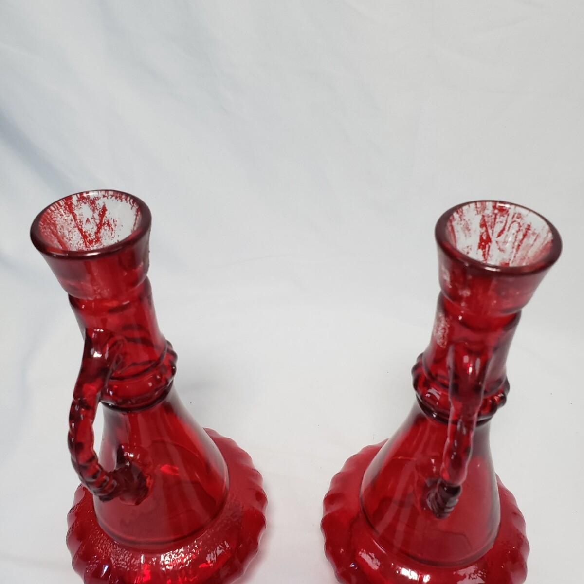 Each bottle features a bulbous base, slender neck, and ornate handle, topped with a matching red glass stopper shaped in a decorative finial style. The red flash finish is visibly flaking and peeling in several areas, revealing signs of shelf-wear and age. Despite the wear, the bottles retain a bold, glossy presence and showcase classic mid?century design. Ideal for collectors who appreciate authentic patina and retro glassware with character.