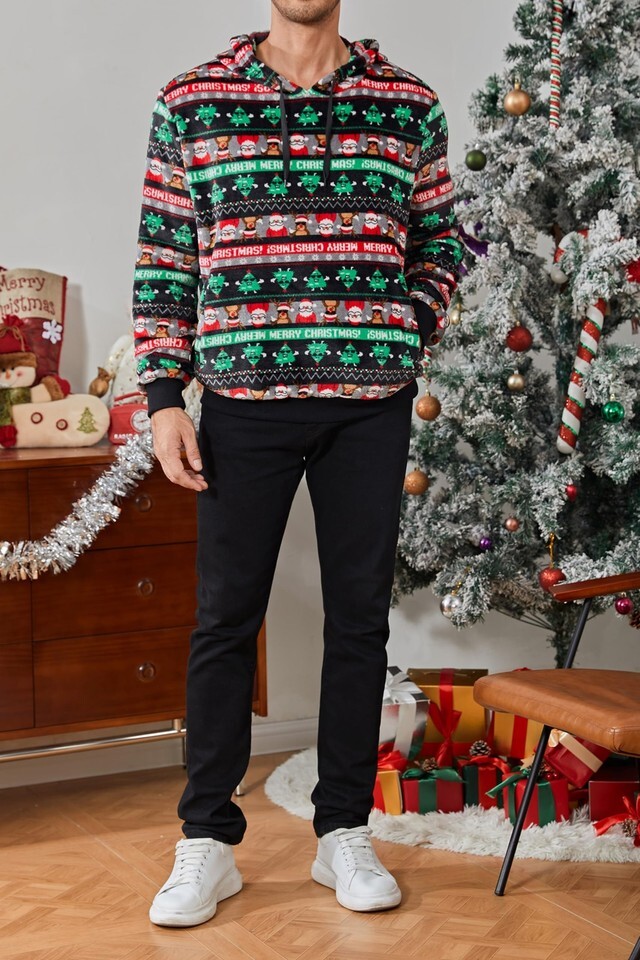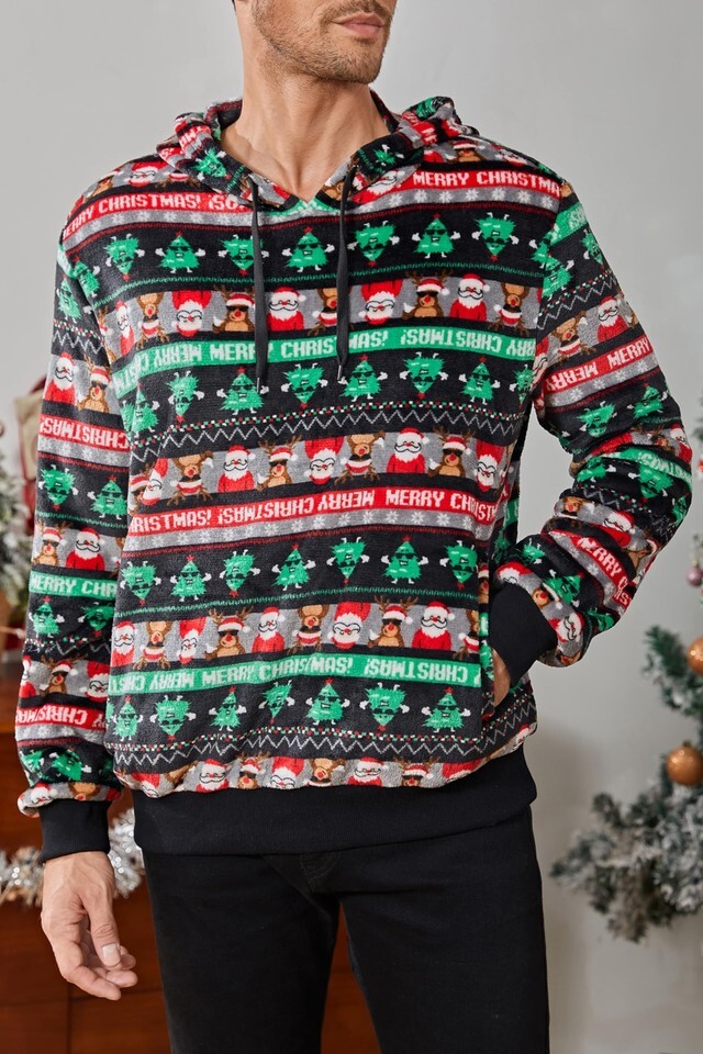 Get into the festive spirit with this Men's Ugly Christmas Sweatshirt. Made with a fuzzy sherpa fabric, this sweatshirt is not only cozy but also features a fun and quirky printed design. The long sleeves and hood provide extra warmth, making it perfect for those chilly holiday gatherings. The kangaroo pocket adds functionality and style, allowing you to keep your hands warm or store small essentials. Whether you're attending an ugly Christmas sweater party or simply want to spread some holiday cheer, this sweatshirt is a must-have addition to your winter wardrobe.