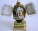 Here we have a beautiful Faberge Egg Replica handmade with gray glass. The materials used for this are glass,enamel, 18kt gold plate, alloy, pewter, stones, swarovski. The egg opens and music plays as this is a music box as well. The egg has beautiful designs all around. The size of the egg from its base is 4.5 by 2 inches or 11 by 5 cm. . The egg is completely handmade by Russian artisans and Made in Russia completely. Inside there is another egg when the compartments are opened. The outside of the egg is handcrafted with glass on the back has a marble like design. Comes in a gift box and well protected.