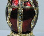 Here we have a beautiful Faberge Egg Replica made with swarovski stones with beautiful designs. The materials used for this are glass, enamel, alloy, pewter, stones and swarovski. This Red egg has beautiful designs of lines and swirls embedded with gems, all around the egg. The size of the egg from its base is 3.5 by 2.5 inches. The egg is made by Russian artisans and Made in Russia completely. The egg itself opens, two parts, with designs that the red has strings of stones in gold lines.