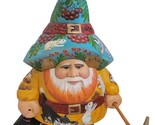 a figure of a mighty Gnome. The piece depicts a gnome with his ax and lantern. On the piece hand painted animals such as a cat chasing a mouse, mice, squirrels, and a raccoons. On his feet there is beautiful decor Carved from one piece of wood, the artists have painted and carved the piece with exceptional detail. The gnome is initialed by the artist conglomerate who created the gnome. Size 9 inches tall by 5 inches wide. Made in Russia. His wooden hat is completely hand painted as well.