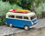A vintage inspired decorative Camper Van in a navy blue tone with 2 surf boards on the roof rack.