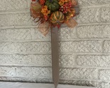 Enhance the beauty of your loved one's resting place with this 18” rustic pine cemetery cross. Expertly hand-painted nutmeg brown with yellow and orange marigolds, orange vine flowers, orange glitter branches, fall colored leaves in red, brown, green, and yellow, two pumpkin picks, and topped off with a orange glitter fall ribbon bow. A heartfelt tribute that radiates the sense of autumn and love. The cross has a pointed end for easy ground insertion. Every cross is sprayed with a coat of clear polyurethane to protect the ribbon and silk flowers from outdoor elements.