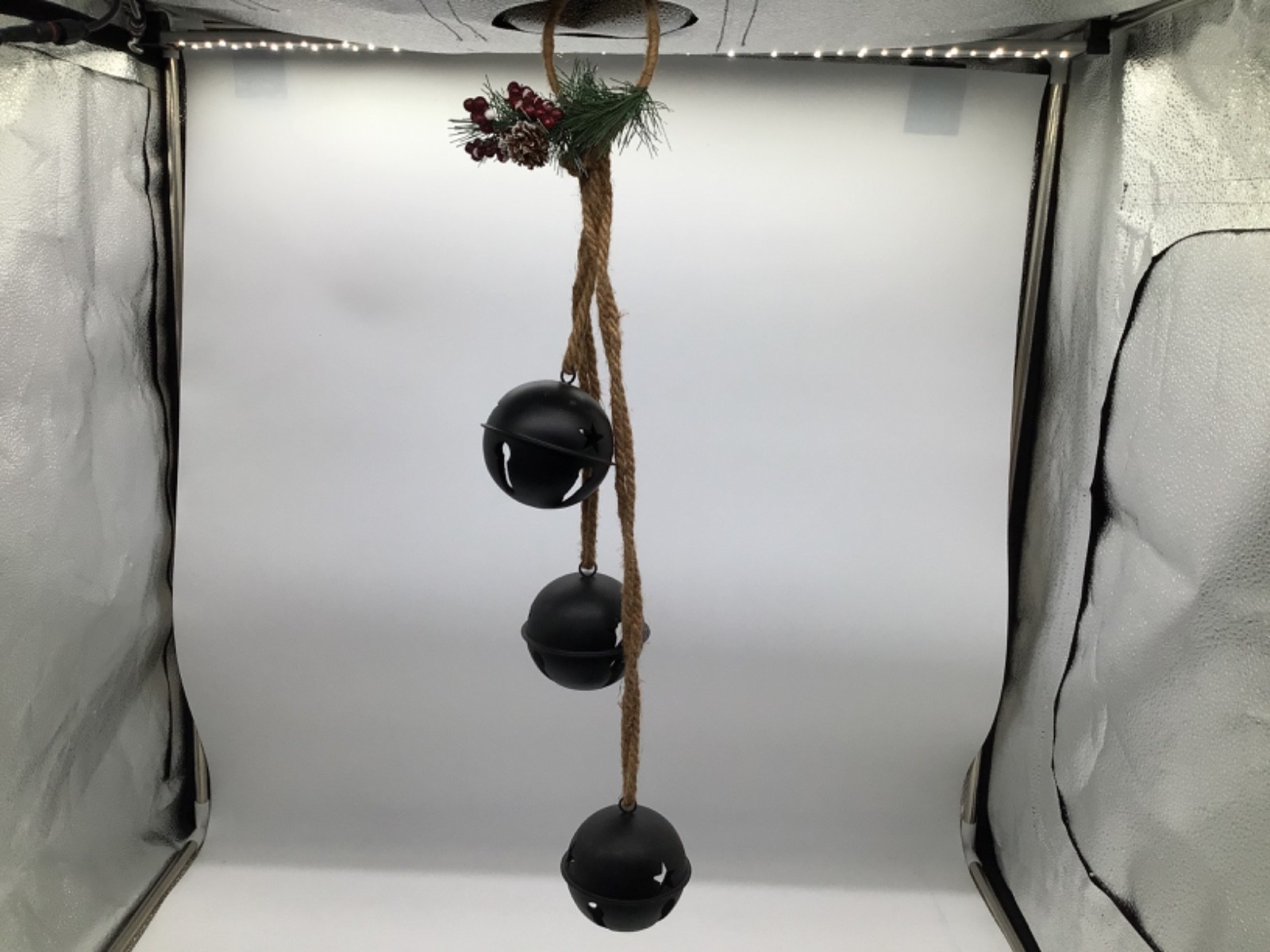 - Rustic Farmhouse Christmas Hanging 3 Black Metal Jingle Bells Rope Pinecone 23"