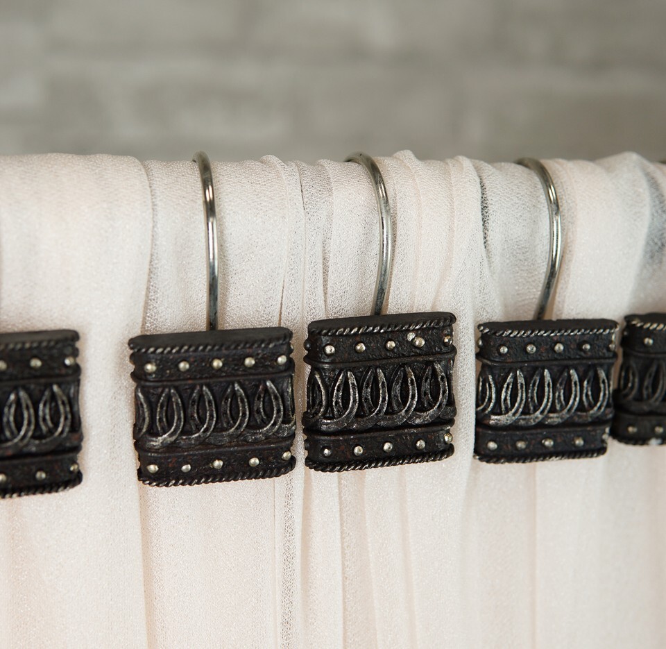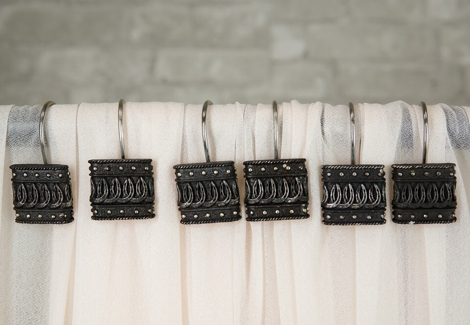 ? This curtain hook style features a multiple horseshoes for extra good luck! Finished in gunmetal gray color, the horseshoes are painted in rustic silver, as well as the nailheads on the borders of the accent block.