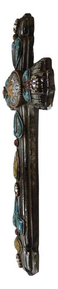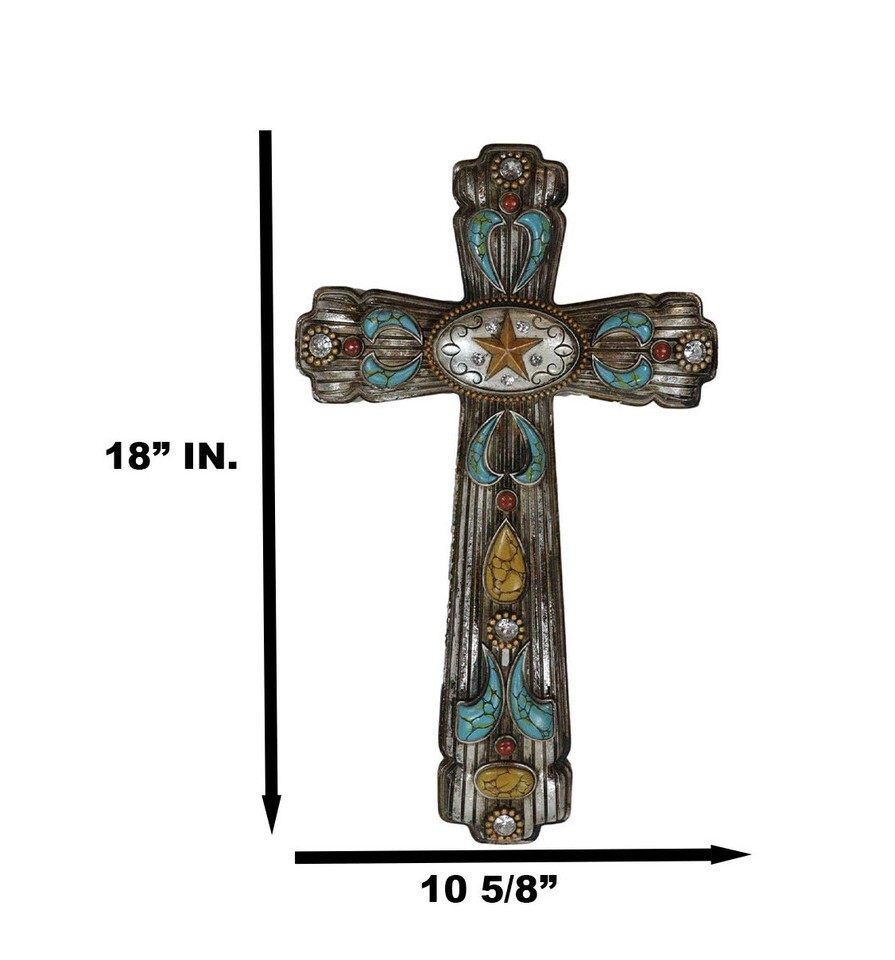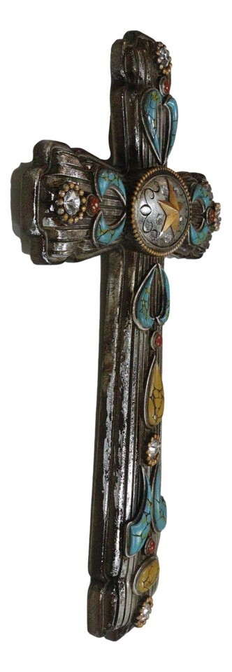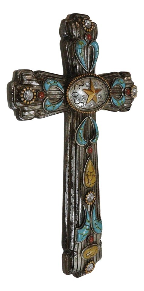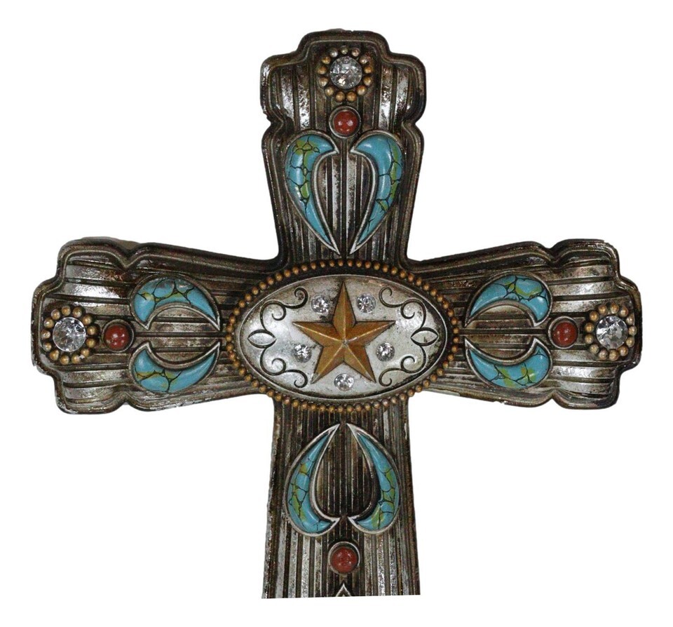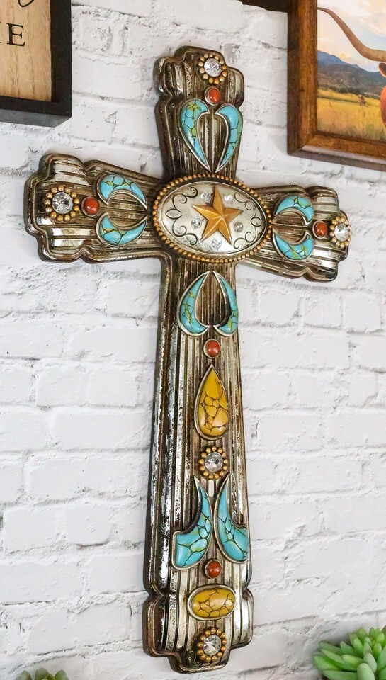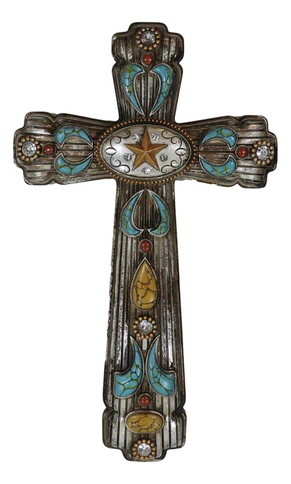 ? Hanging a cross in your room reminds your household of Christ Jesus's ultimate sacrifice for the sins of all mankind. This cross is both symbolic and bold, featuring ornate turquoise patterns and a unique oval silver concho piece with a western star at the center. The cross is perfect for your wall, as a standalone wall decor or as a collage with other wall sculptures.