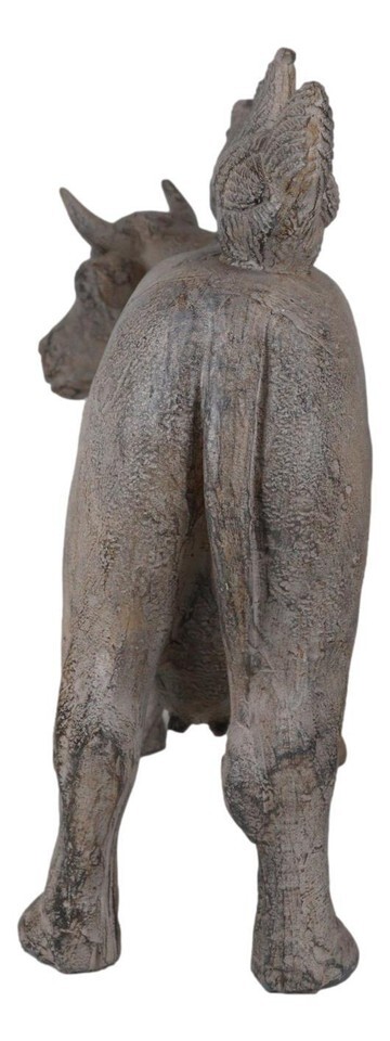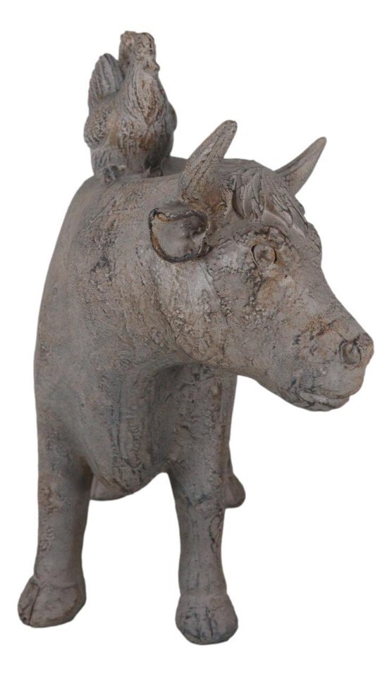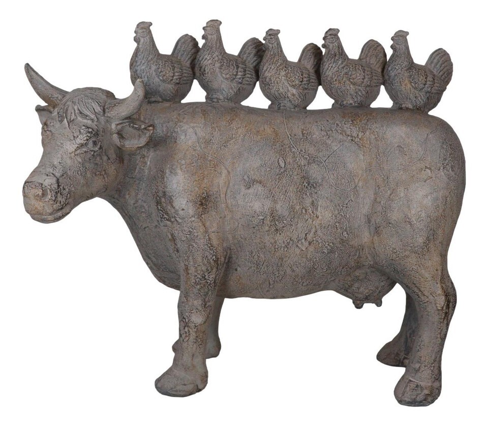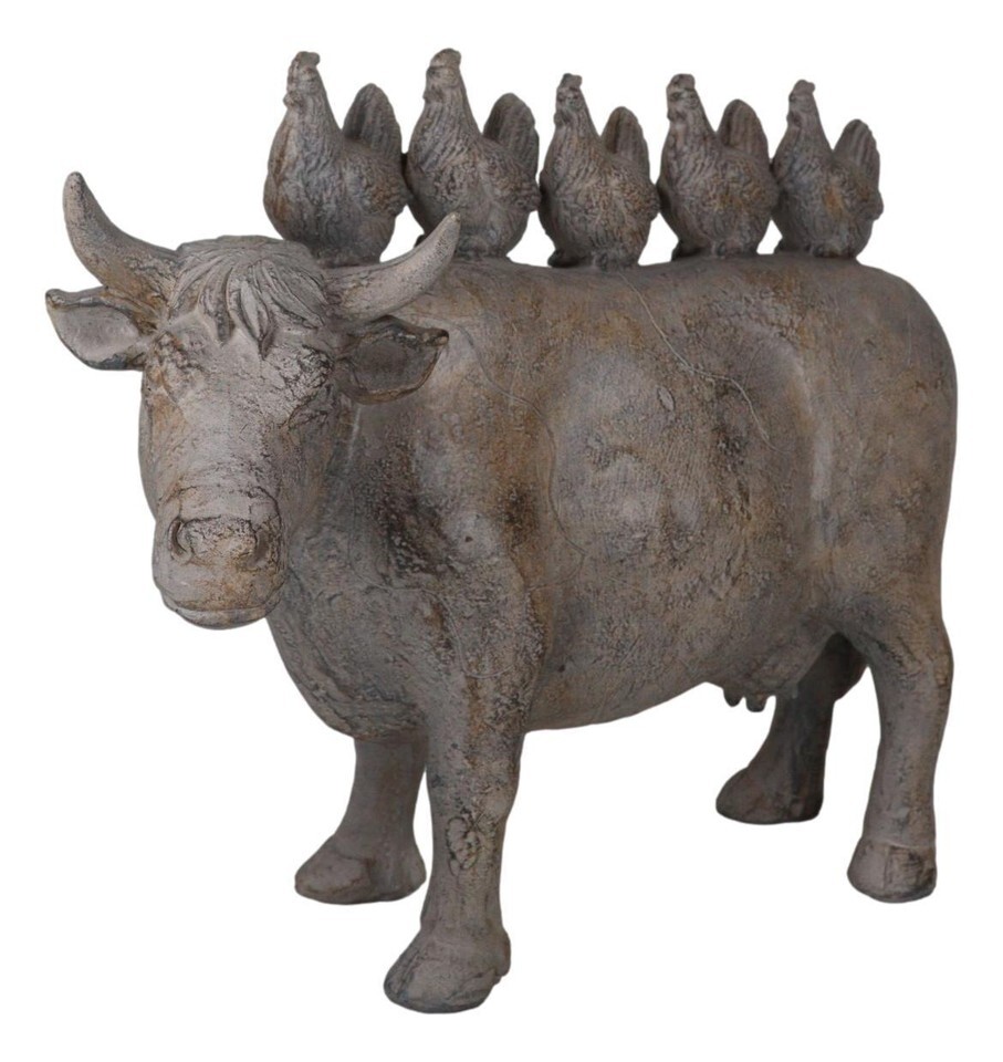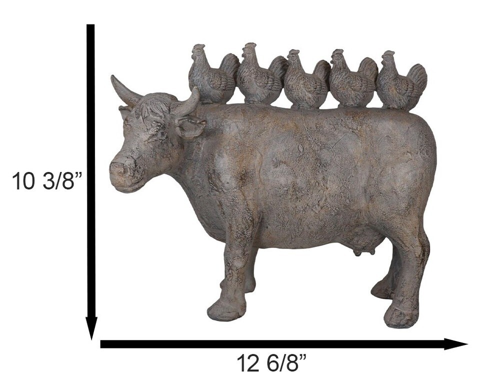 ? This Realistic Farm Chickens On Cow Statue is made of designer composite resin, hand painted and polished in rustic finish. Color Tone may vary.
