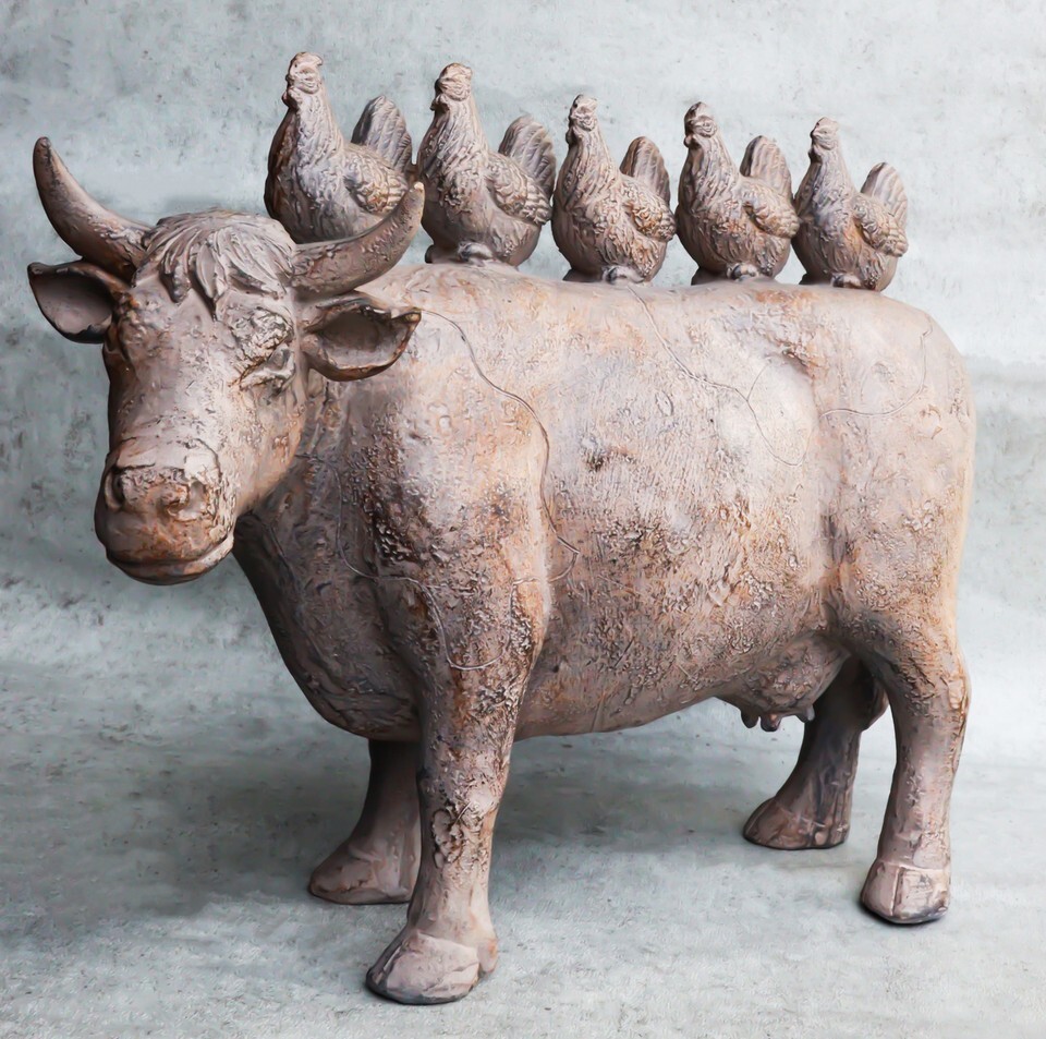 ? Introducing an enchanting sight that will undoubtedly captivate all who behold it-the Chickens Marching Atop Cow Statue! Witness a whimsical display as a delightful group of chickens confidently parades upon the back of a majestic cow sculpture. Each chicken struts with pride, displaying their unique plumage and radiating a contagious sense of joy. Crafted with meticulous attention to detail, this charming statue brings a touch of countryside charm and delightful whimsy to any space it graces.