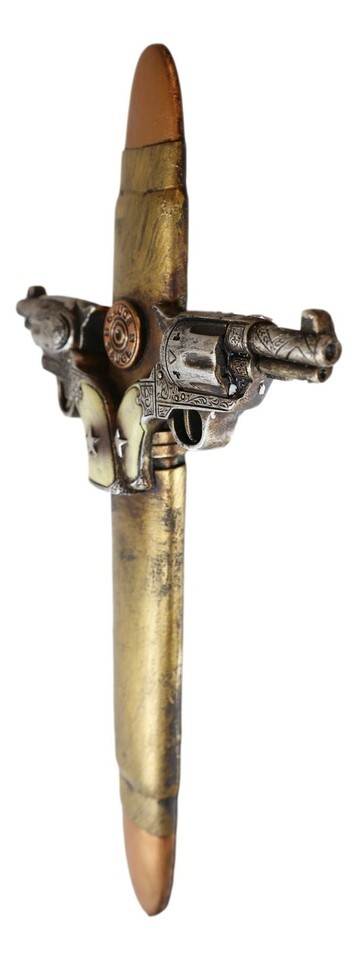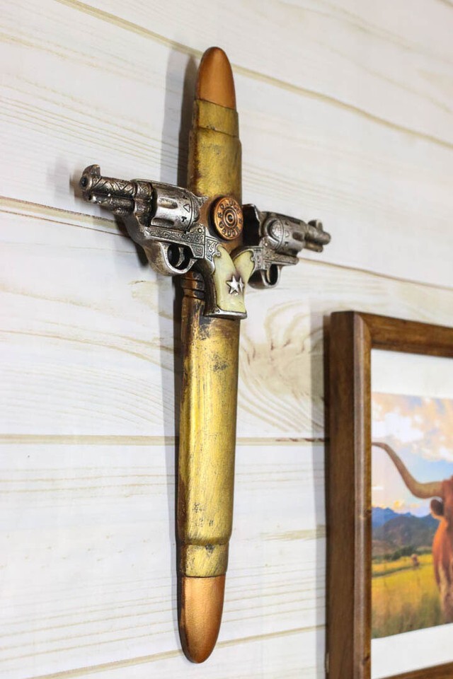 ? Western decor is all about spunk and spirit, bringing together the desert beauty of the southwest with rugged cowboy charm and rustic good looks. This unique wall cross adds a patriotic element in the form of a cross with a bullet casing shell vertical beam and 2 hand gun pistols facing away from each other to make up the horizontal beam.