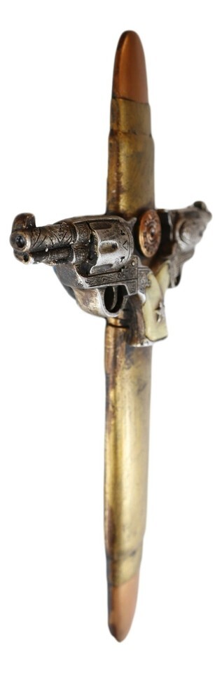 ? This dual hand gun pistols with bullets wall cross is made of polyresin, hand painted and polished individually.
