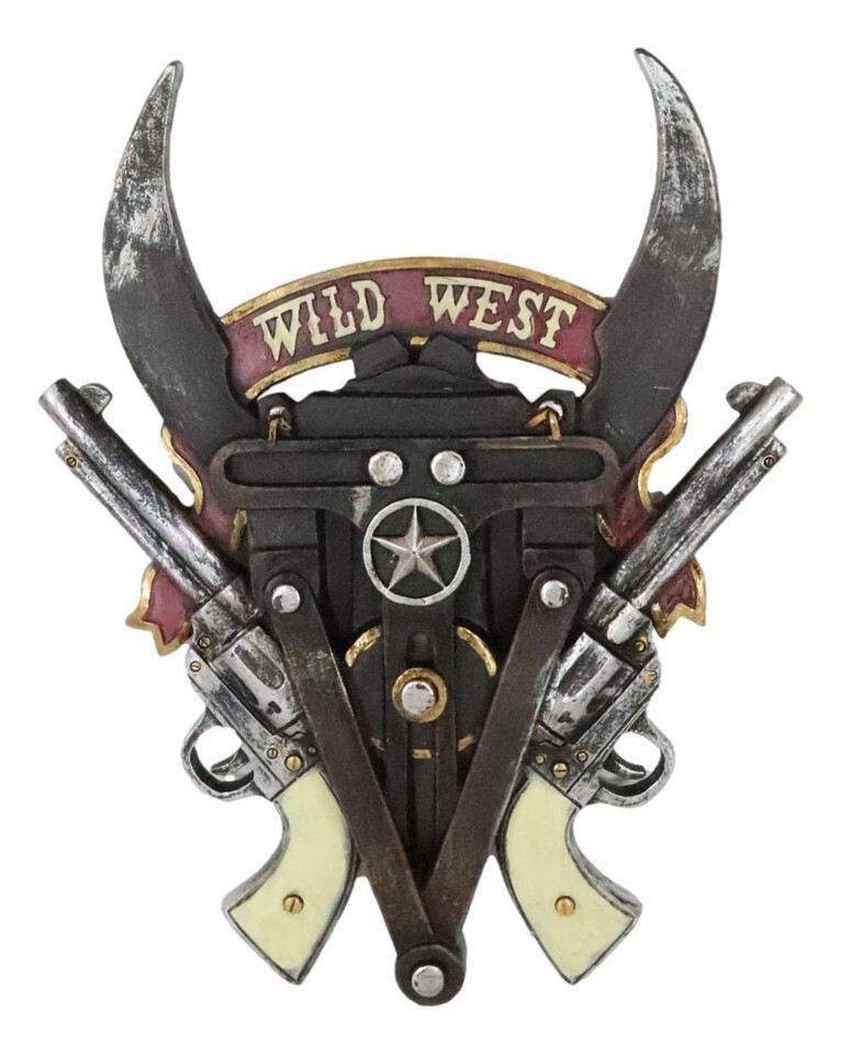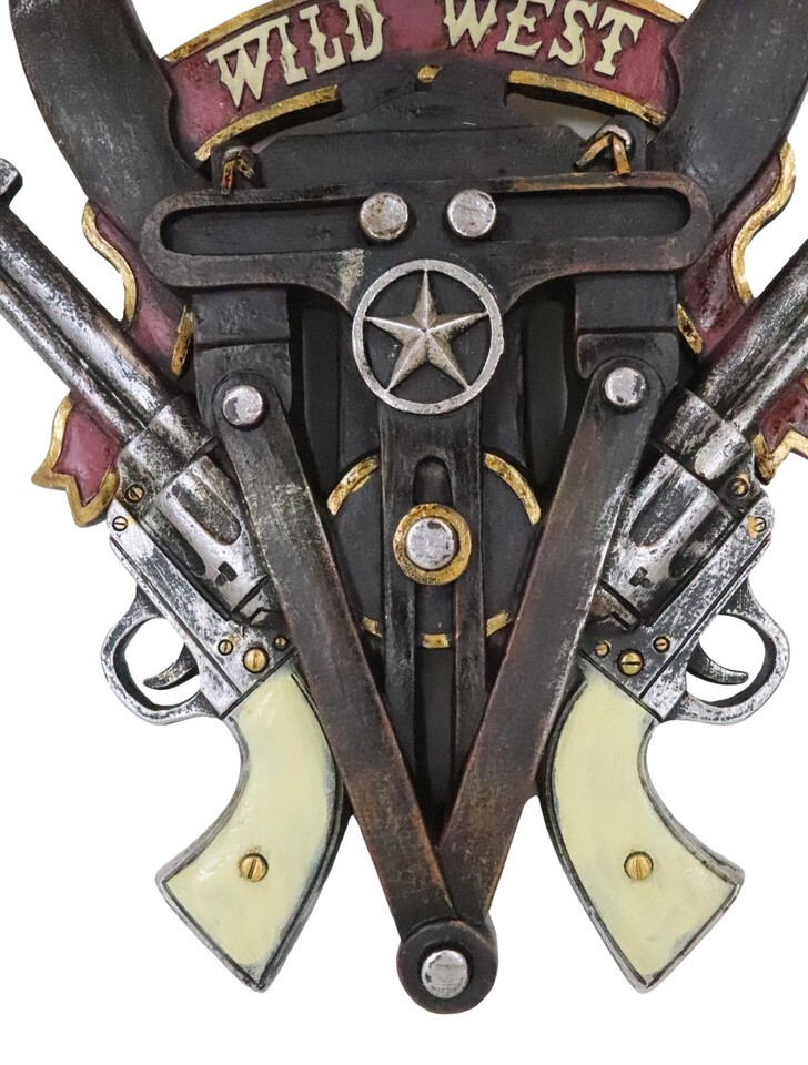 ? Introducing our captivating Wild West Texas Longhorns Western Star and Dual Revolver Pistols Wall Plaque, a remarkable tribute to the rugged spirit of the Old West. This stunning piece of art combines iconic symbols of the wild frontier, including majestic longhorns, a Western star, and dual revolver pistols, creating a captivating display of power, freedom, and untamed beauty.