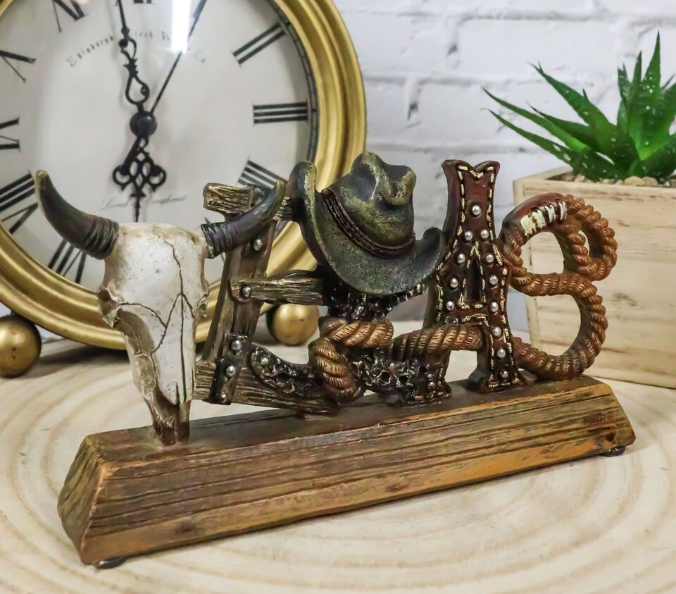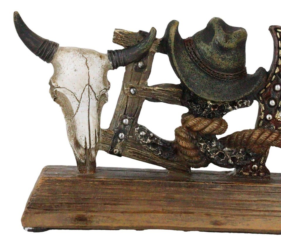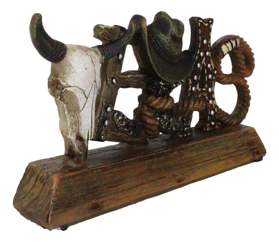 ? Rope a Western themed room with this unique desktop plaque featuring the word art TEXAS in unique cowboy Old World icons. From a cow skull, barnwood with nailheads, cowboy hat, faux leather artwork and shaped lasso ropes, this TEXAS word art desktop plaque will impress! A faux wooden base holds everything together to present a wild wild west accent to your desktop, mantel or shelf.