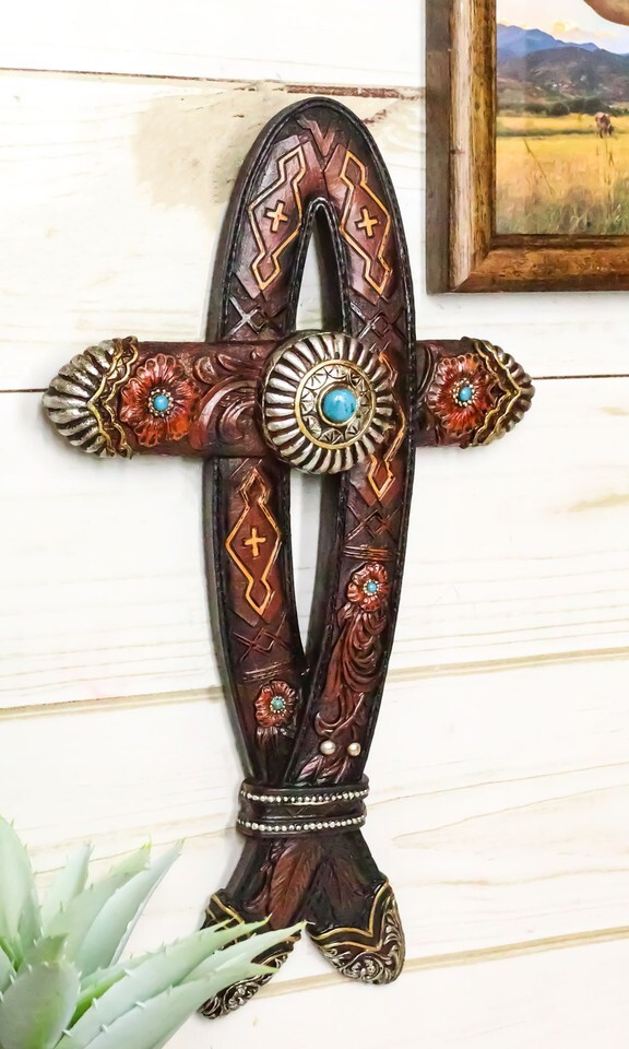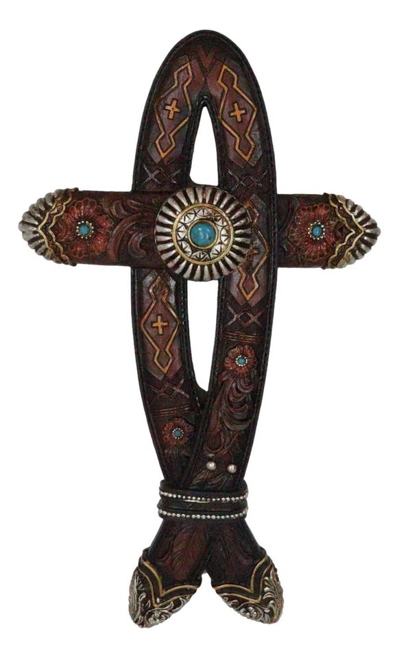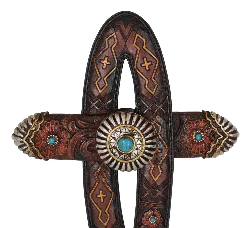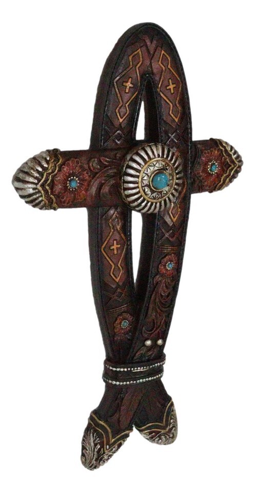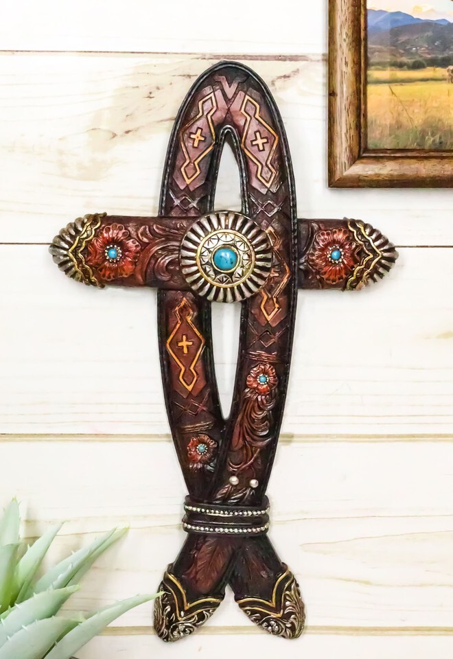 - Rustic Western Turquoise Gem Concho Tooled Leather Belt Ichthys Fish Wall Cross