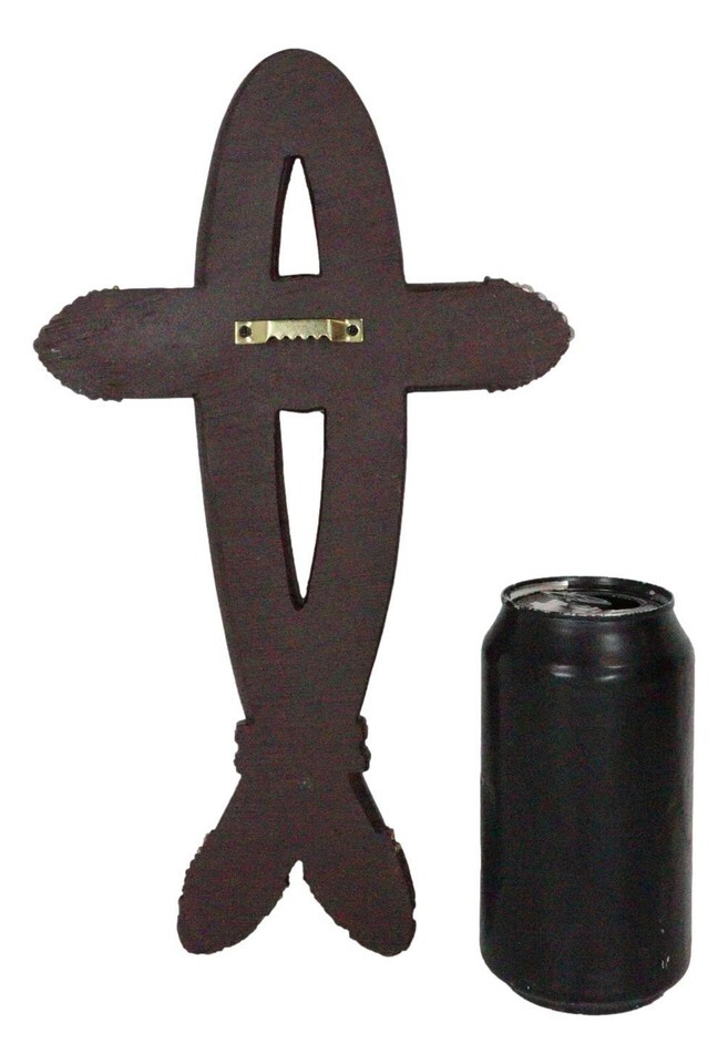 ? This Ichthys Christ Fish Wall Cross Sculpture is made of polyresin, hand painted and polished individually.