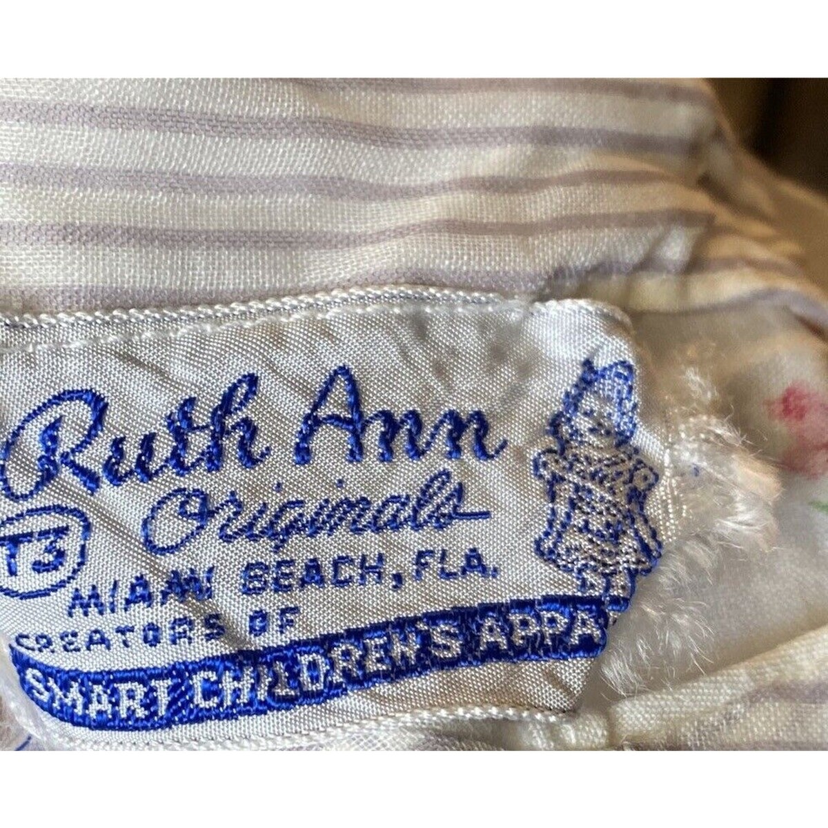 Ruth Ann of Miami Beach specialized in fine children?s wear during the 1950s, often using organdy, cotton, and rosebud prints popular in midcentury party dresses. These designs embodied the optimism of postwar America and remain highly collectible today.