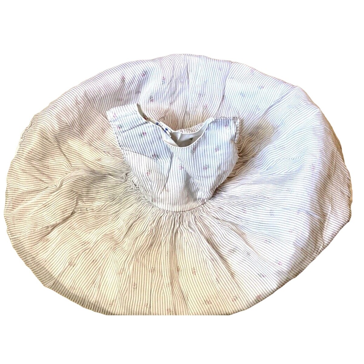 Vintage 1950s Ruth Ann of Miami Beach toddler girl?s party dress, sized about 2T/3T. Features a sheer pink, lavender, and white striped organdy overlay with a delicate rosebud-print cotton slip underneath. A truly sweet piece of midcentury children?s fashion.