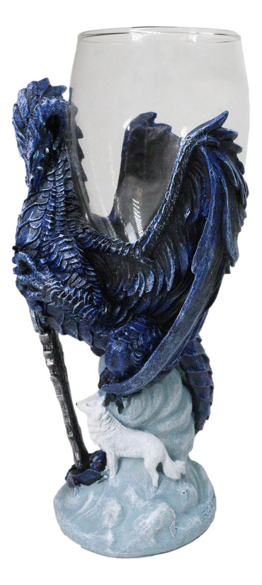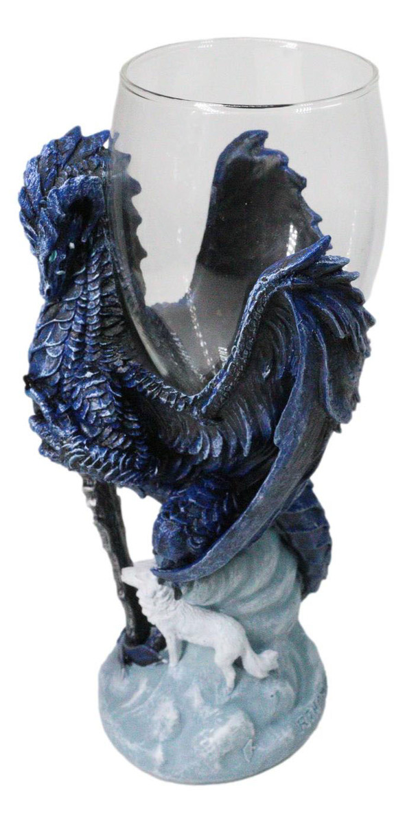 ? This Ruth Thompson Dragon Blade Series Glass Wine Goblet is made of designer composite resin and glass, hand painted and polished individually. Color Tone may vary slightly from photos.