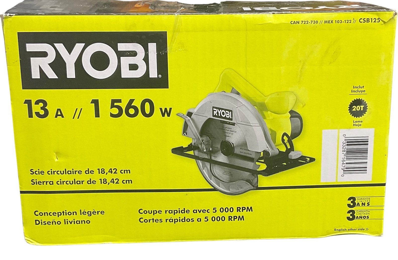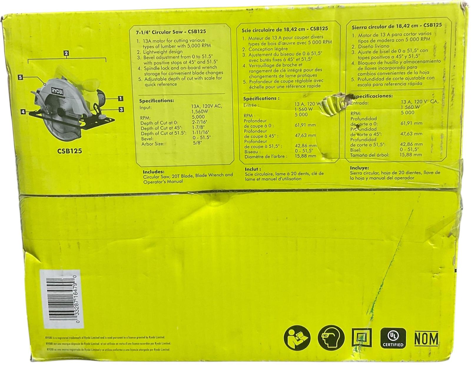 Category: Corded hand toolsType: Circular SawBrand: RyobiModel number: csb125Size: 7- 1/4Color: greenPower source: ElectricBattery Included: noCase included: noCharger Included: noVoltage: 13 ampCondition:Used
