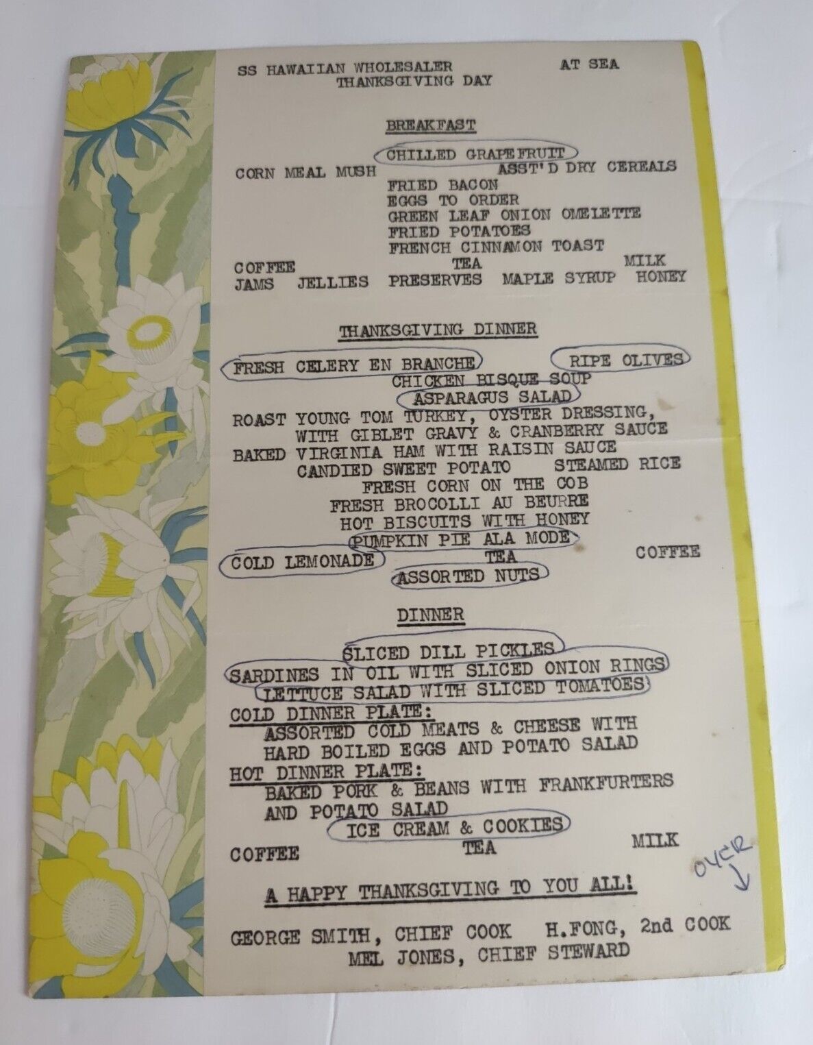 S.S. Hawaiian Wholesaler Menu. Thanksgiving day.