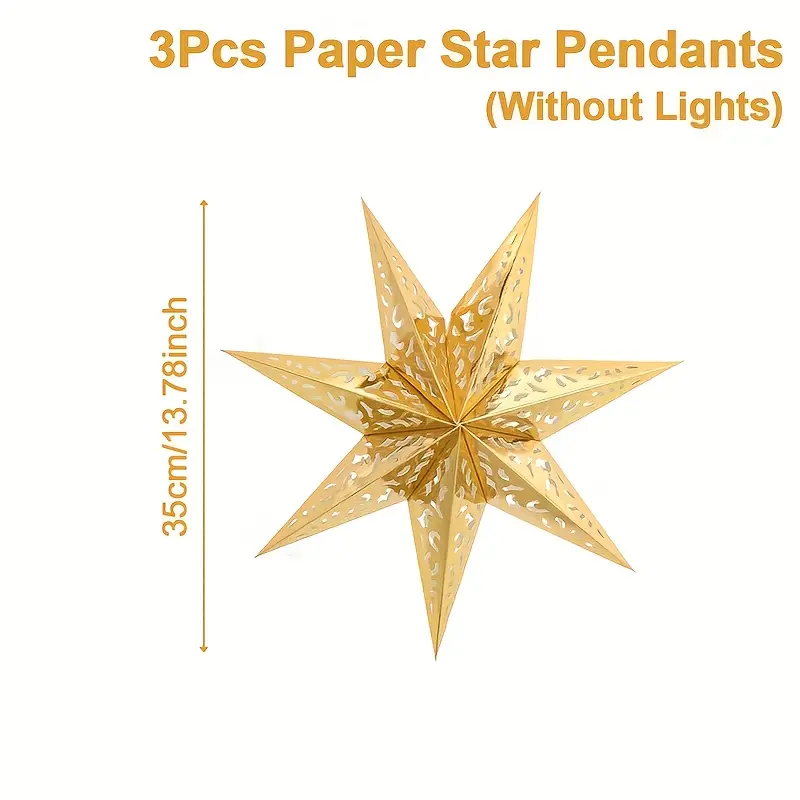 This set of 3 elegant 3D paper star hanging pendants is perfect for Christmas decor. Each pendant measures 14 inches and features a star shape with a gold color, making them a festive addition to any holiday display.