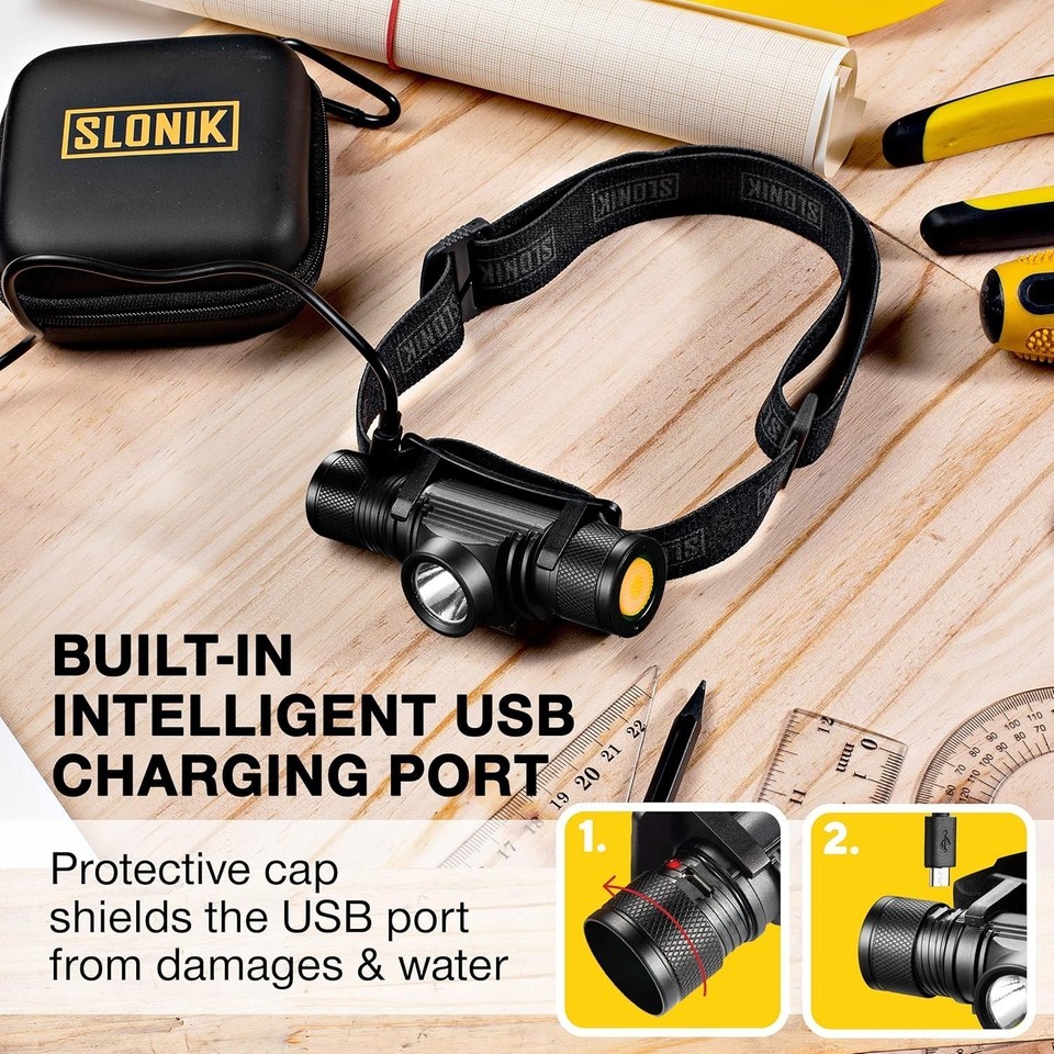 - SLONIK - Adjustable beam - 500 Lumen Rechargeable LED Headlamp 2200 mAh Battery