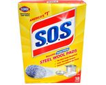 SOS Steel Wool Soap Pads 18 Pack. Reusable Soap Filled Steel Wool Pads. No dish soap required. Cuts through grease. Removes baked-on food. Removes tough messes inside and outside your home. Reusable, versatile and with incredible scrubbing power. Makes aluminum, iron and stainless steel pots and pans Sparkle. Package contains: 18 Steel Wool Soap Pads. DDD-88648