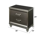 Features: 2 Storage Drawers Drawer: Sparkling Trim, Embossed Fronts, GLIDE Side Metal (Ball Bearing, 2/3 Ext.), DOVETAIL English Front Back, Felt Lined Top Drawer Only, Safety Stop Included, Manual Close, Dust-Proof Bottom Case Only, Hardware: Single Pull Handle, Metal (Zinc Allow w/Acrylic) Wooden Case-Leg: Front Frame Solid Rubberwood, Front Top Embossed Panel (MDF, PB) Wood Tapered Leg: Dark Champagne Finish, Leg Size: 4 Inches H (100mm) Drawer Box: MDF w/Paper (PU), Corner Block Tenon Joint (Pin Glue) Set Includes: One (1) Nightstand