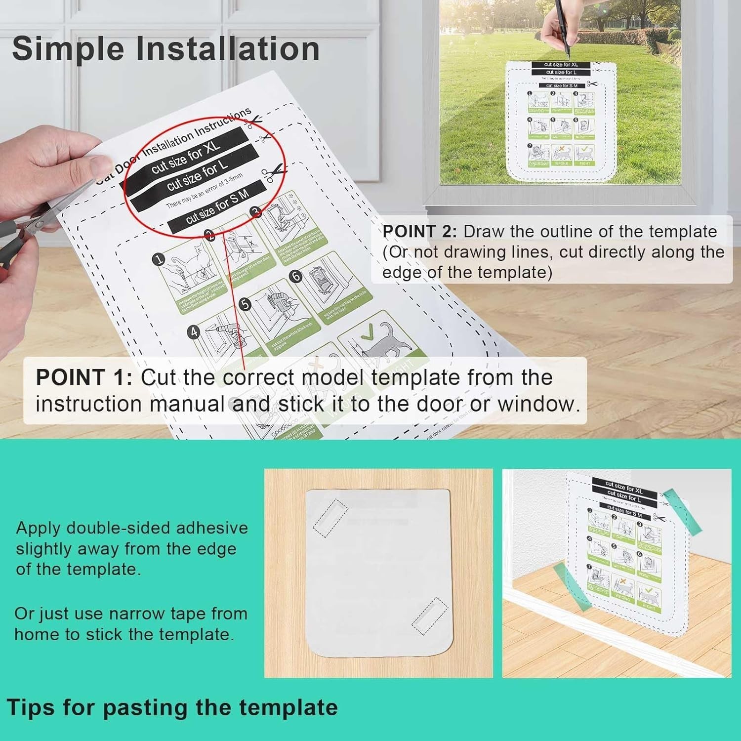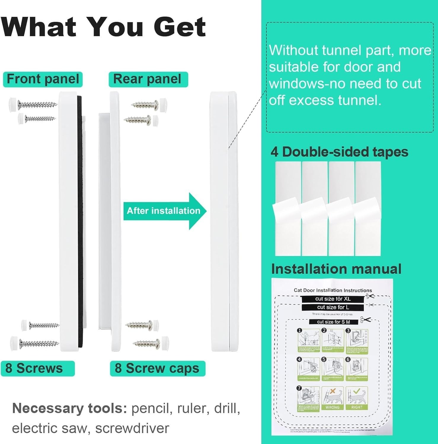 Discover the ultimate convenience and security with our versatile Cat Door for Windows and Doors. Designed for easy installation without the need for cutting, this pet door features four lock modes to control your pet's access and keep unwanted visitors out. Crafted from durable ABS plastic, it offers a comfortable, long-lasting space for your cats or small dogs, with sealing strips and magnets to keep out bugs and odors, while reducing energy loss. Whether you have a sliding glass door, wooden door, or window, the sleek 0.78-inch thick panels fit seamlessly, providing a hassle-free solution for pet owners. Package includes clear instructions, screws, caps, and double-sided tape for quick setup.