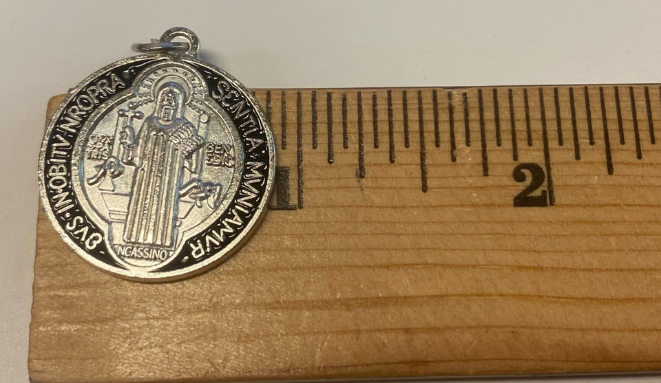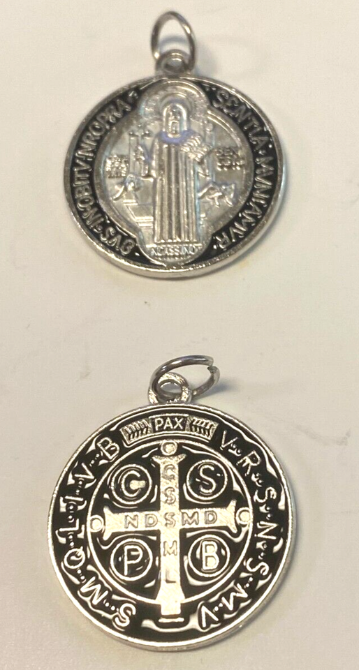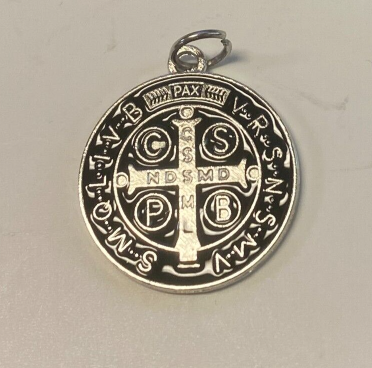 Your purchase is for a Saint Benedict black silver tone medal. It is very nice medal. Made of zinc alloy. Measures approximately 1" diam, the size of a quarter. Please see pictures for details.