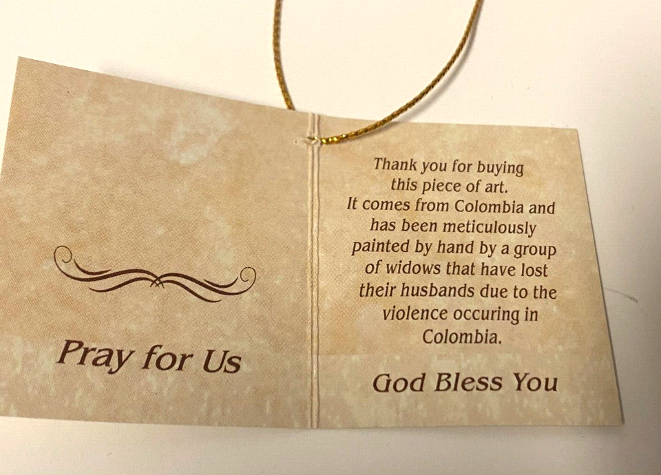 These statues were hand painted by a group of widows that have lost their husbands due to the violence occurring in Colombia. They come from the Liscano Collection.