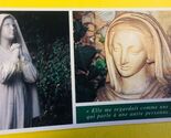 You are purchasing a colored post card with 2 images, of Saint Bernadette and Our Lady of Lourdes. The back is blank. Approximate measurements is: 8" x 4" . Made of thick paper stock. The front message is in french: Which translates to; " She was looking at me, like a person speaking to another person". Were brought back from France.