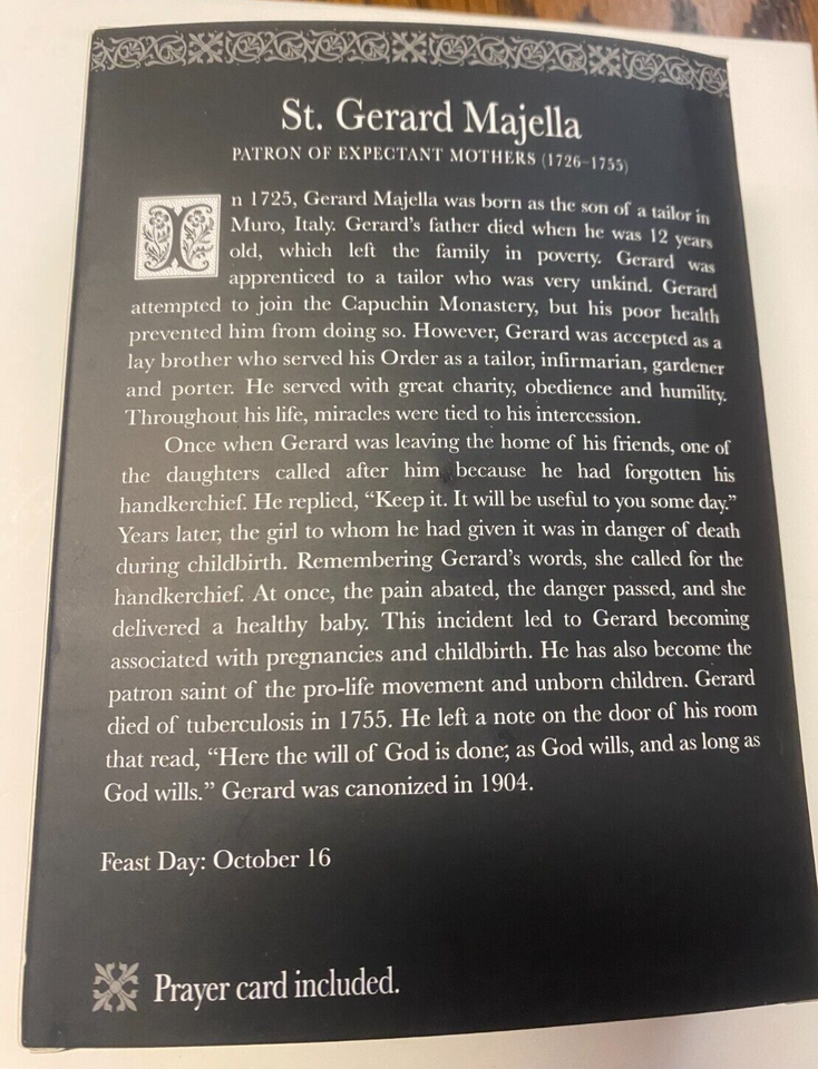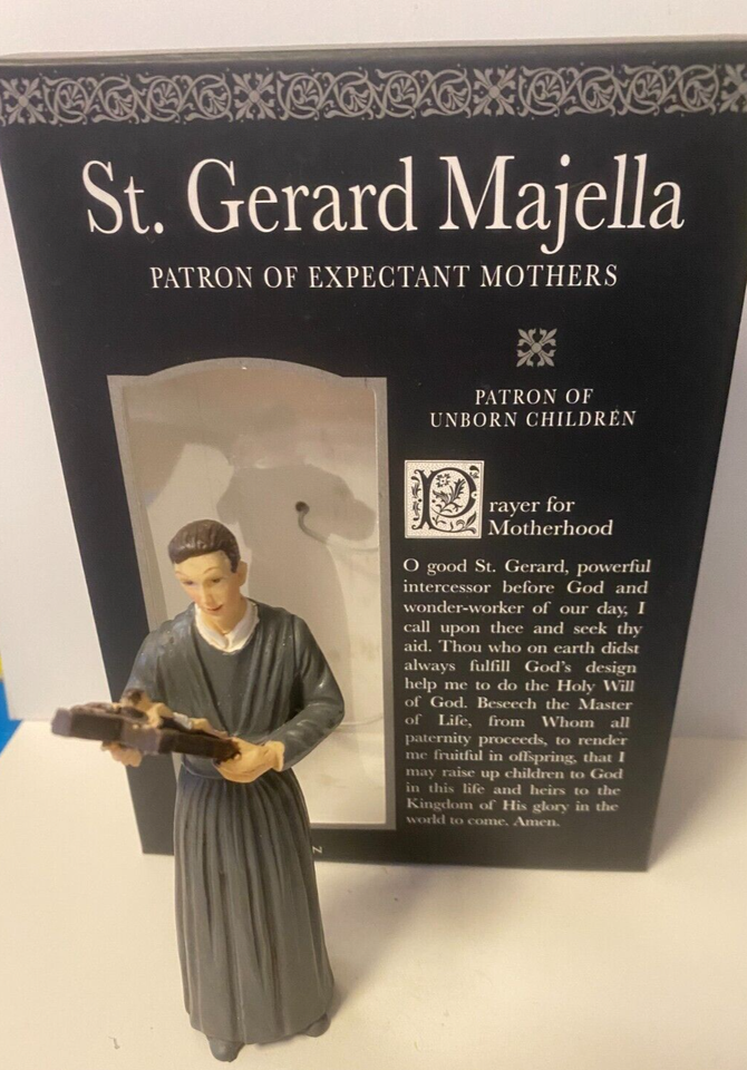 You are purchasing a very nice small statue of Saint Gerard Majella. He is the patron saint of expectant mothers. It comes boxed with a prayer and bio, also a prayer card.