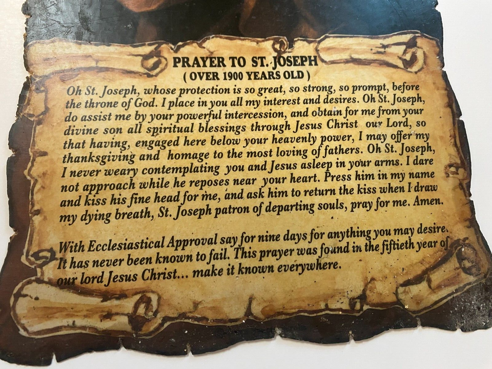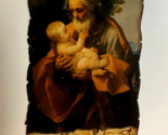 You are purchasing a beautiful wax paper wall canvas with scalloped burned edges, comes with a stick for easy hanging. These were brought back from the Holy Land. The image of Saint Joseph with Child, is a very beautiful image and has a prayer with Ecclesiastical Approval to pray for nine days. They come from the Terra Sancta Scrolls collection, they are rare and difficult to find.