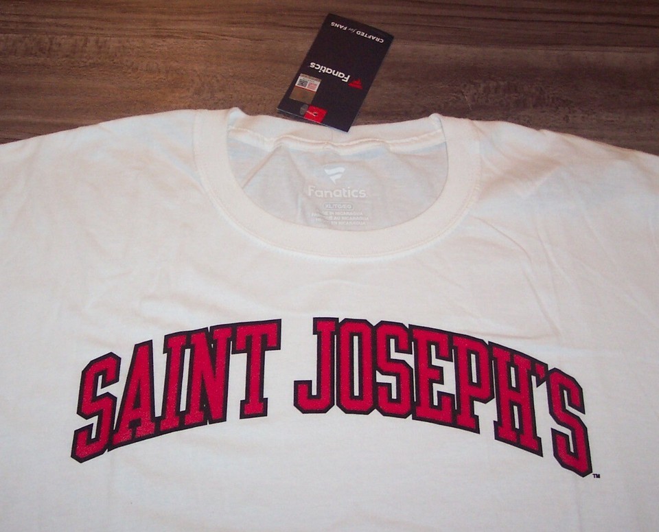 This is a SAINT JOSEPH'S UNIVERSITY HAWKS T-shirt. It is a Size XL and is NEW with the tag. It is 24 inches from armpit to armpit and 31 inches in length. It is an official FANATICS T-shirt . Combine auctions to save on shipping. D4AG