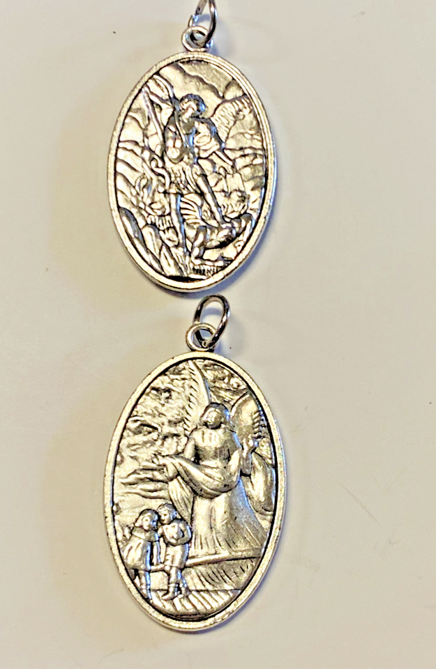 You are purchasing a very nice silvertone large oval medal of Saint Michael the Archangel and Guardian Angel . This is a 2 sided medal.