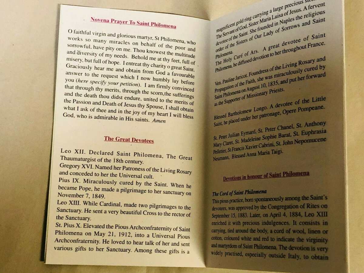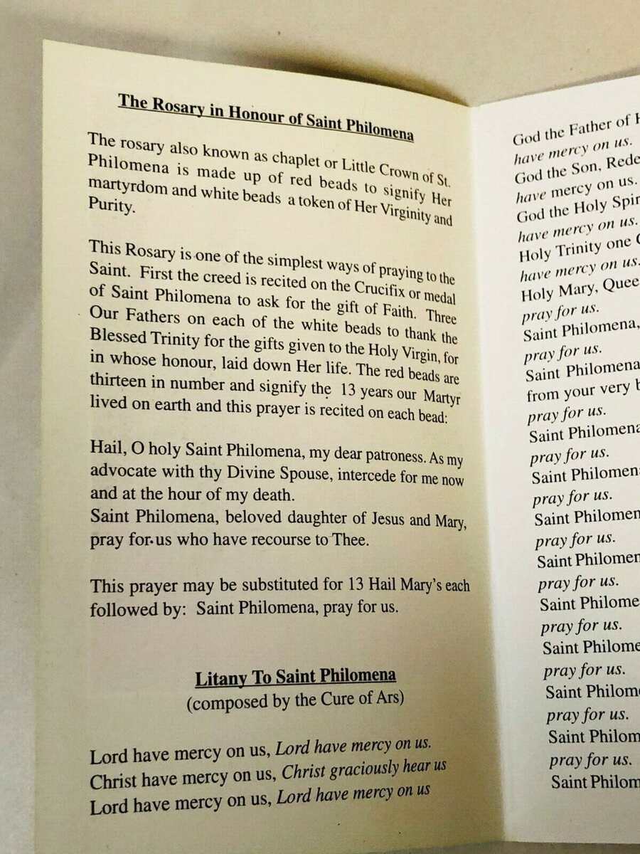 You are purchasing a thin cardstock accordion style folder with Devotions to Saint Philomena brought back from her shrine in Mugnano del Cardinale, Italy. Approximate measurements: 5 1/2" X 3 1/4".