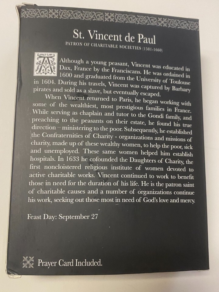 You are purchasing a very small 3.5" H statue + biography and prayer card of Saint Vincent de Paul. He is the patron saint of serving the poor needy.