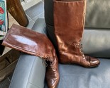 Salvatore Ferragamo Brown leather knee-high boots for women featuring a lace-up front detail.