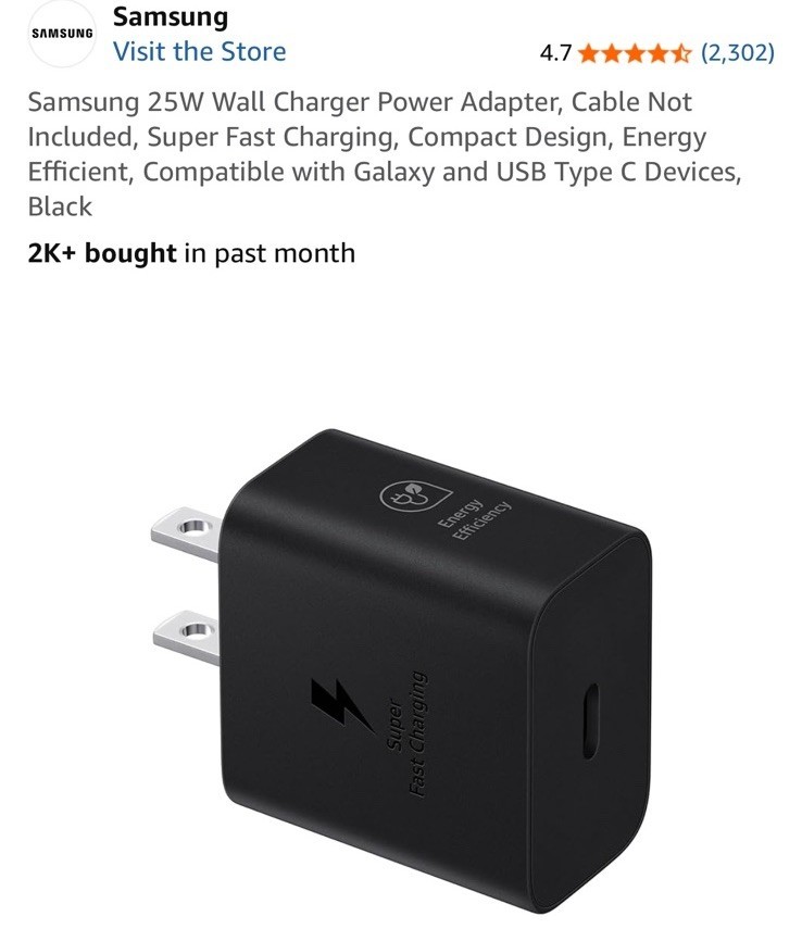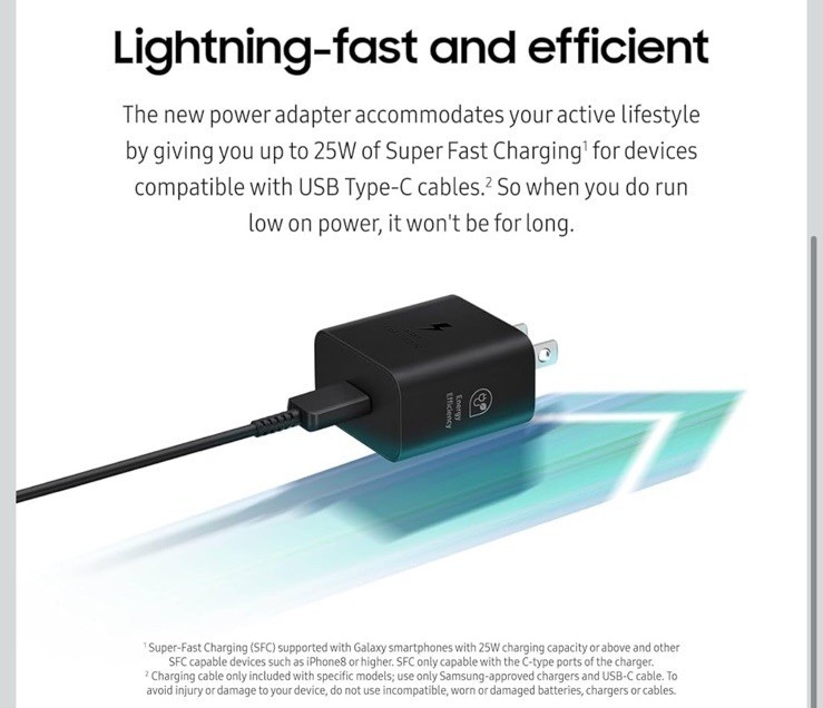- Samsung 25W PD Power Adapter, Black - 25 W - 3 A Output - Black