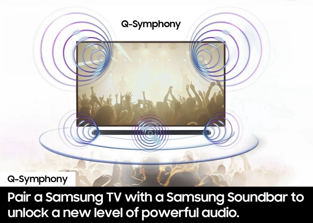 ? Q-Symphony-Pair a Samsung TV with a Samsung Soundbar to unlock a new level of powerful audio. Experience content like never before only with Samsung products. With Q Symphony, your speakers work together to optimize all the audio channels to operate as one.
